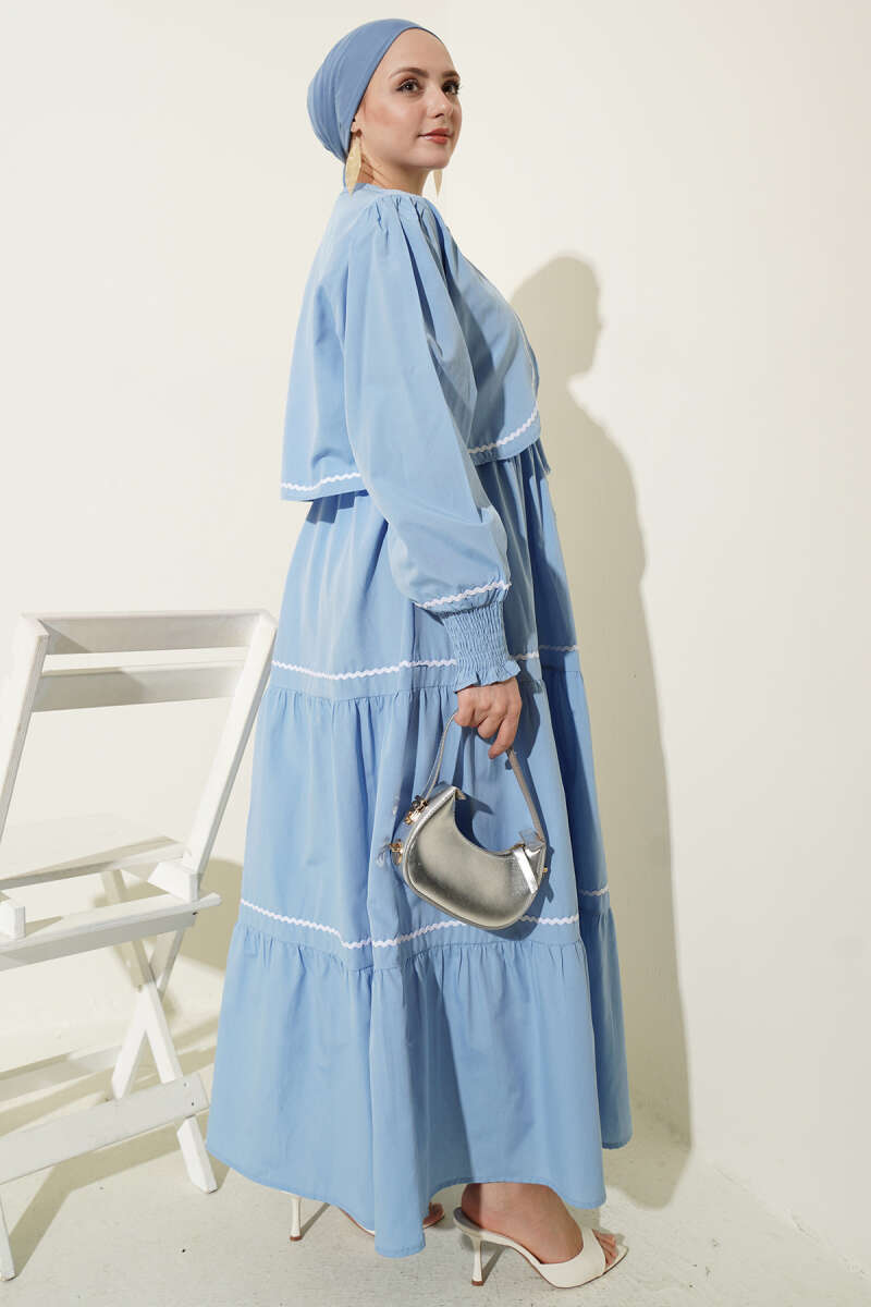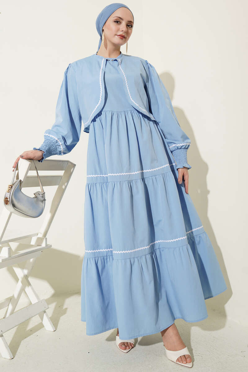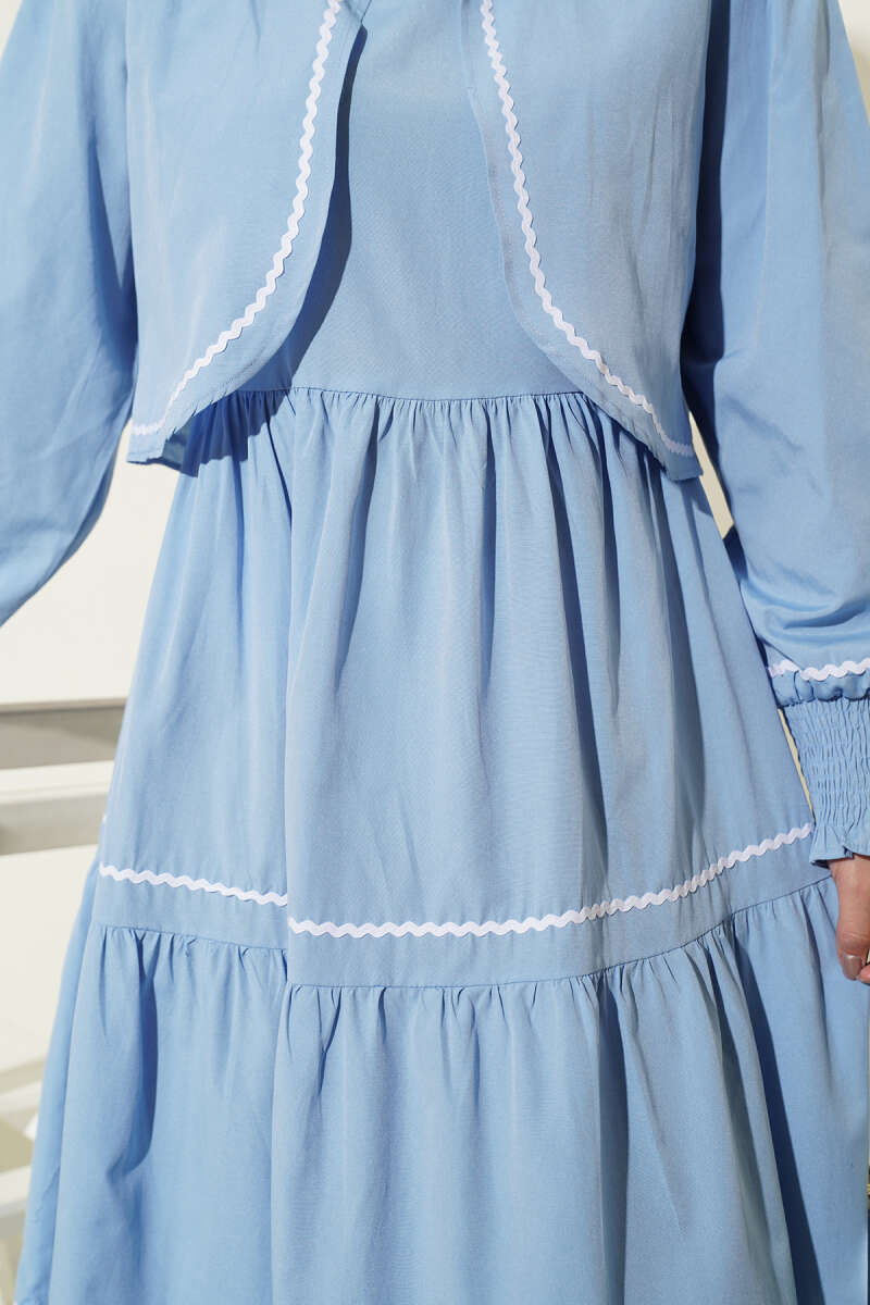 Zarif ve modern bir tasarıma sahip olan bu ikili set, bol kesim elbisesi ve tamamlayıcı kısa ceketiyle şık bir kombin sunuyor. Ceket kenarlarında, kol manşetlerinde ve elbisenin etek katlarında yer alan beyaz dalgalı şerit detayları, tasarıma hareketli ve sofistike bir görünüm kazandırıyor. Elbisenin katlı etek yapısı ve esnek büzgülü manşetleri gün boyu konforlu bir kullanım sağlarken, yüksek kaliteli kumaşı dökümlü bir duruş sergiliyor.