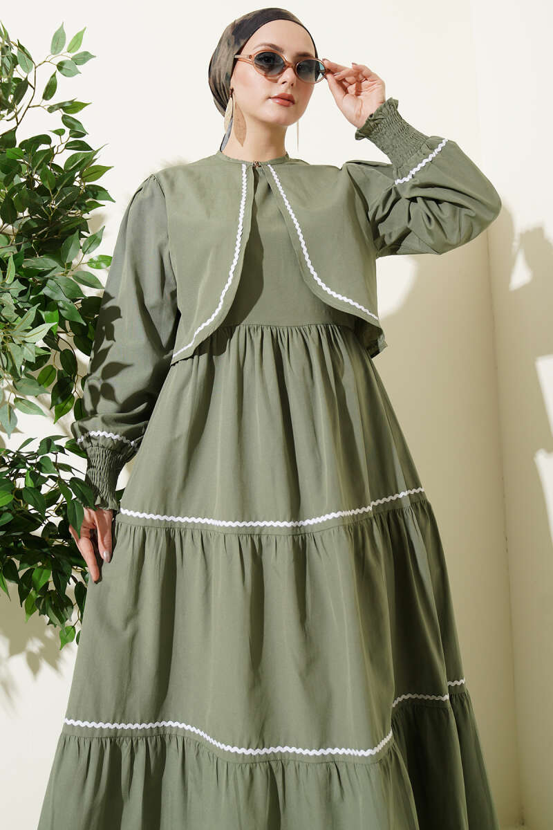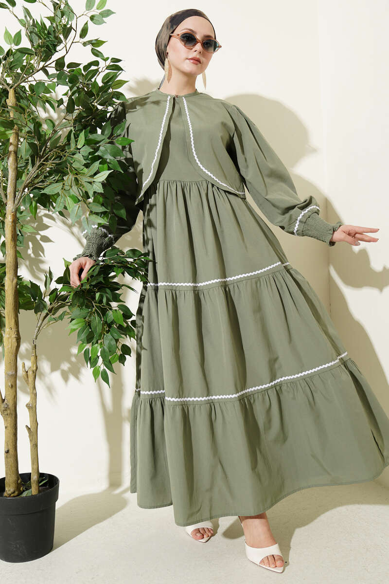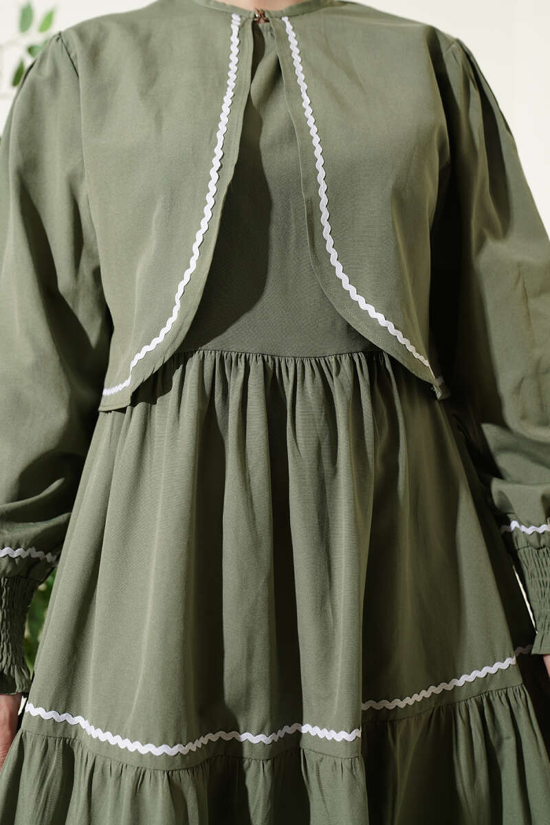 Zarif ve modern bir tasarıma sahip olan bu ikili set, bol kesim elbisesi ve tamamlayıcı kısa ceketiyle şık bir kombin sunuyor. Ceket kenarlarında, kol manşetlerinde ve elbisenin etek katlarında yer alan beyaz dalgalı şerit detayları, tasarıma hareketli ve sofistike bir görünüm kazandırıyor. Elbisenin katlı etek yapısı ve esnek büzgülü manşetleri gün boyu konforlu bir kullanım sağlarken, yüksek kaliteli kumaşı dökümlü bir duruş sergiliyor.