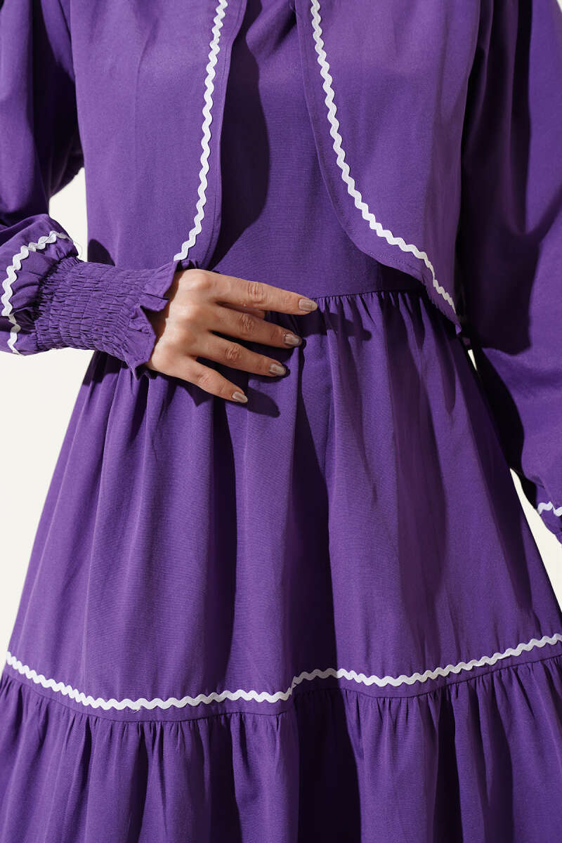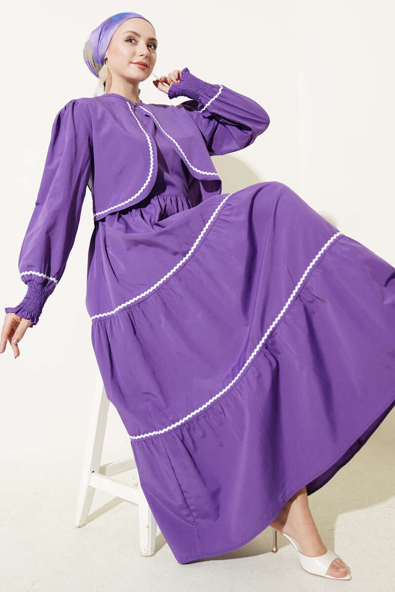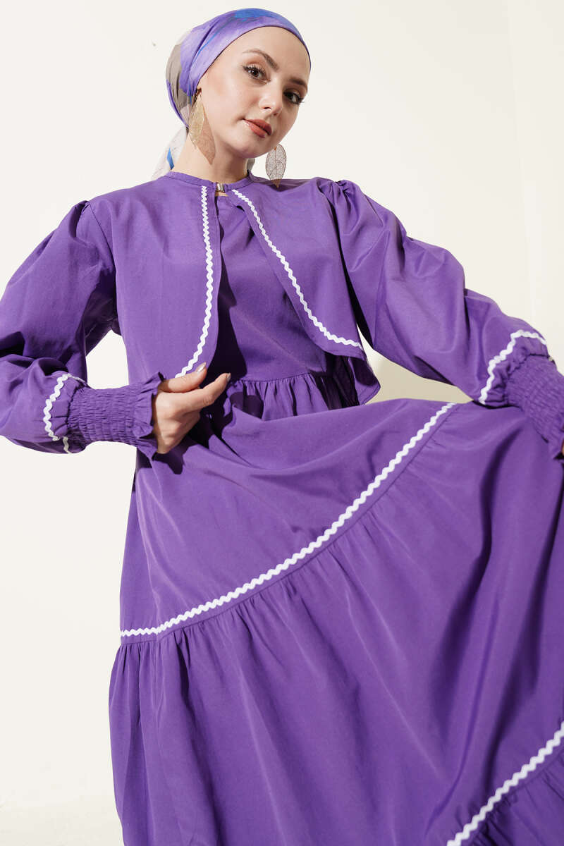 Zarif ve modern bir tasarıma sahip olan bu ikili set, bol kesim elbisesi ve tamamlayıcı kısa ceketiyle şık bir kombin sunuyor. Ceket kenarlarında, kol manşetlerinde ve elbisenin etek katlarında yer alan beyaz dalgalı şerit detayları, tasarıma hareketli ve sofistike bir görünüm kazandırıyor. Elbisenin katlı etek yapısı ve esnek büzgülü manşetleri gün boyu konforlu bir kullanım sağlarken, yüksek kaliteli kumaşı dökümlü bir duruş sergiliyor.