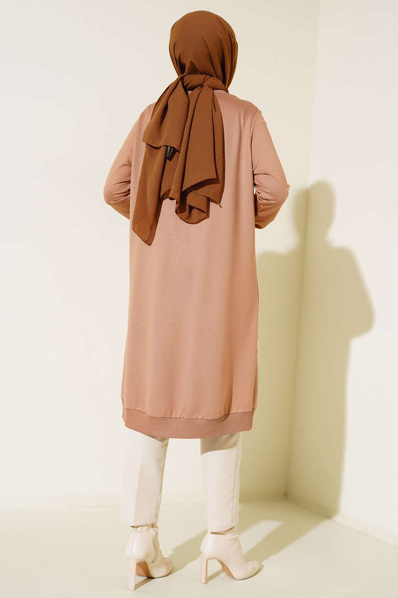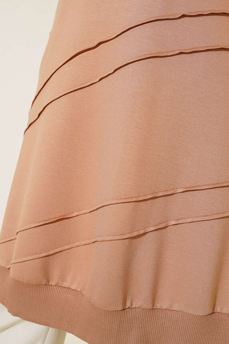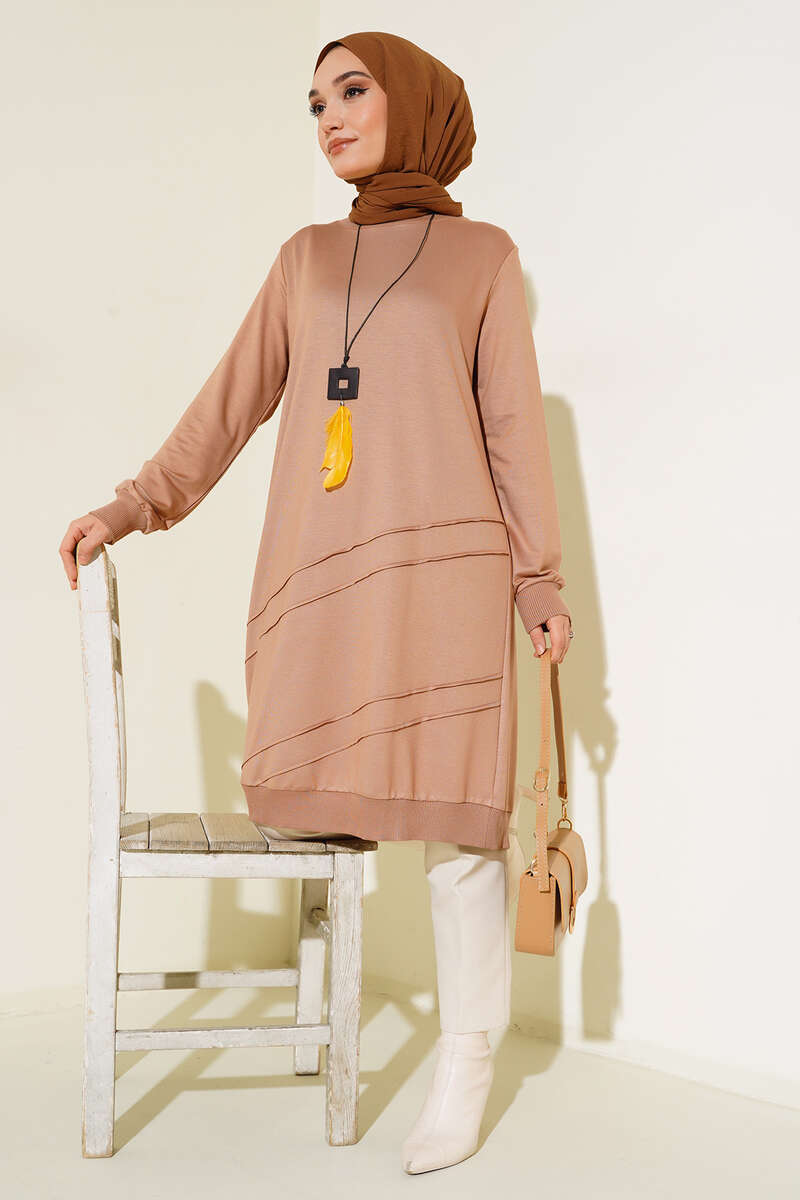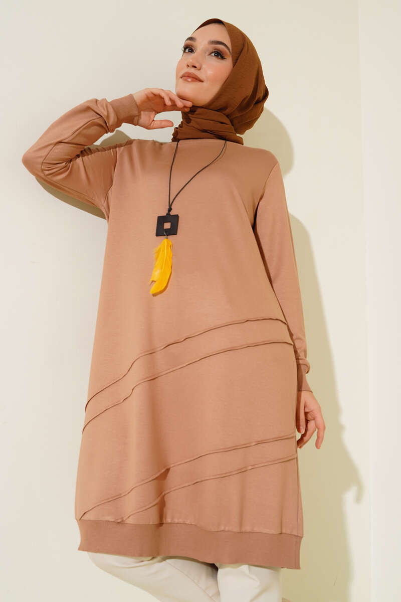 Nervür Dikişli Kolyeli Uzun Tunik Bej