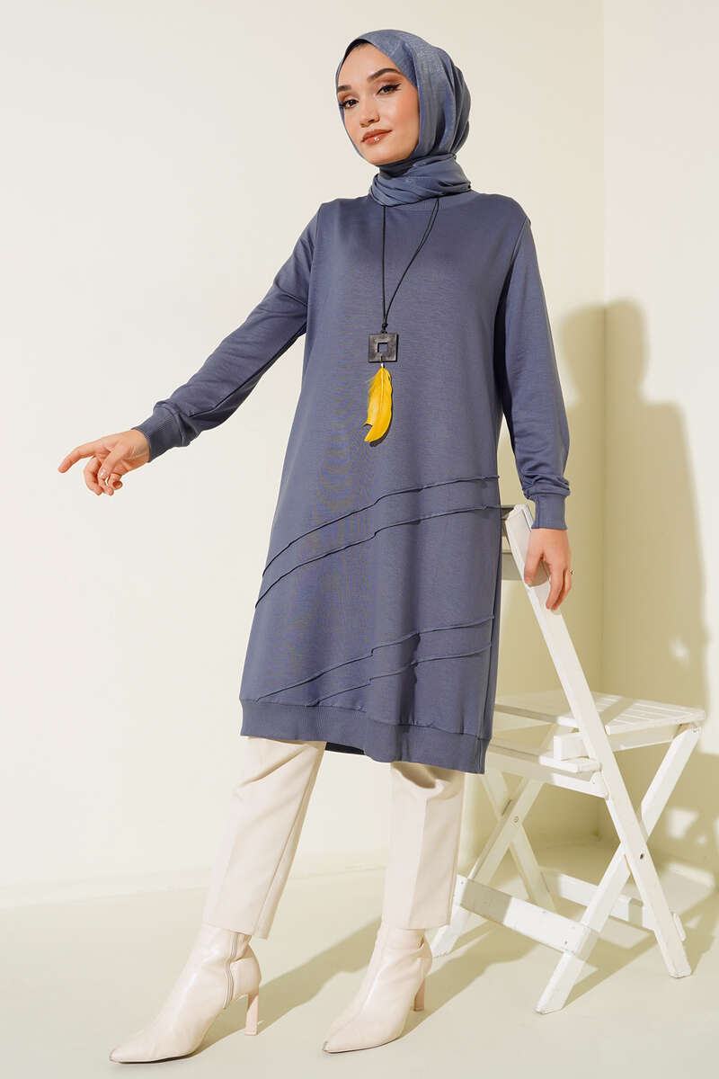 Nervür Dikişli Kolyeli Uzun Tunik Gri