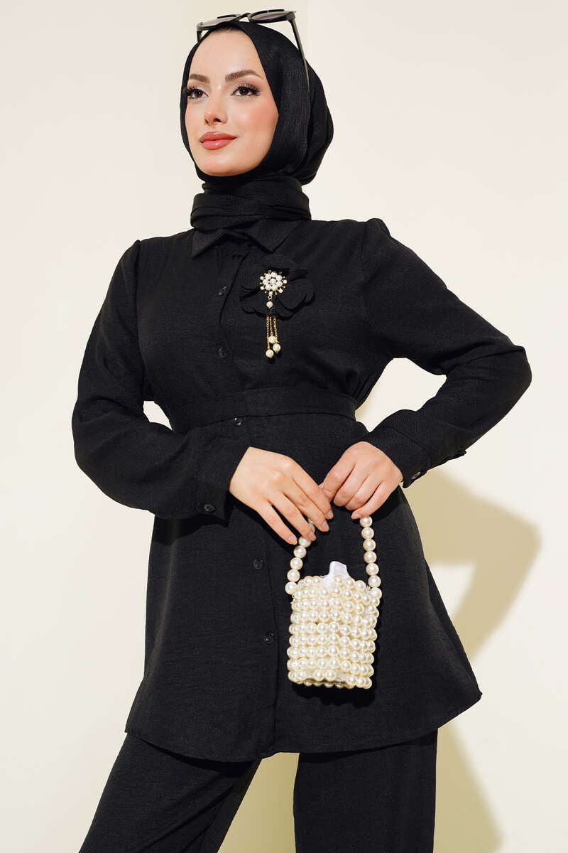 Yeni sezon ikili takım modelimiz sizlerle beraber. Tuniğimiz boydan düğmelidir. Kol bilekleri manşetli ve düğmelidir. Kendi kumaşından kuşağı vardır. Pantolonumuzun beli lastiklidir. Cepsizdir. Sade ve şık ikili takımımız özel günlerinizin favorisi olacak. Renk seçenekleri mevcuttur. Broş Aksesuar Olarak Kullanılmıştır.