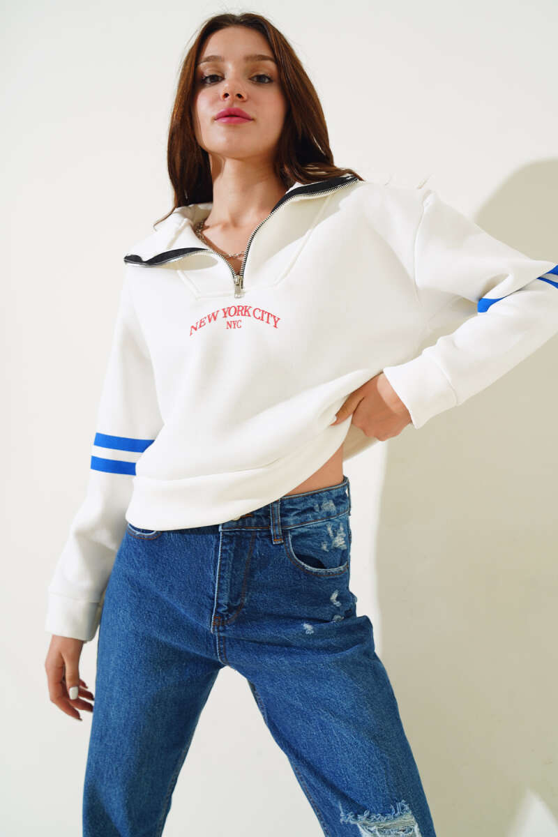 New York Baskılı Üç İplik Kısa Sweatshirt Ekru