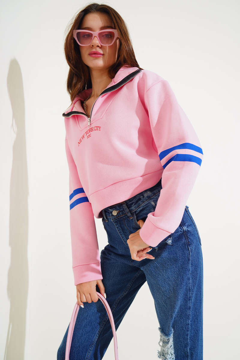 New York Baskılı Üç İplik Kısa Sweatshirt Pembe