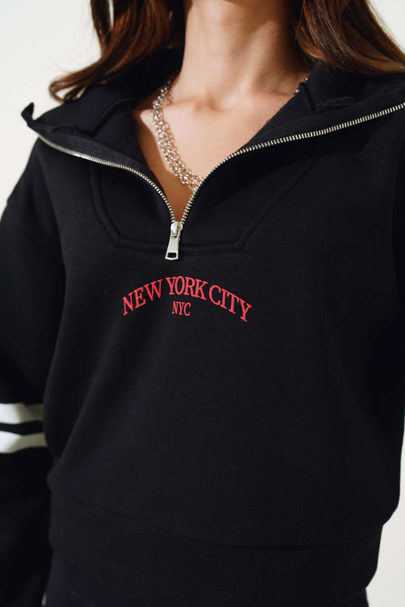 New York Baskılı Üç İplik Kısa Sweatshirt Siyah