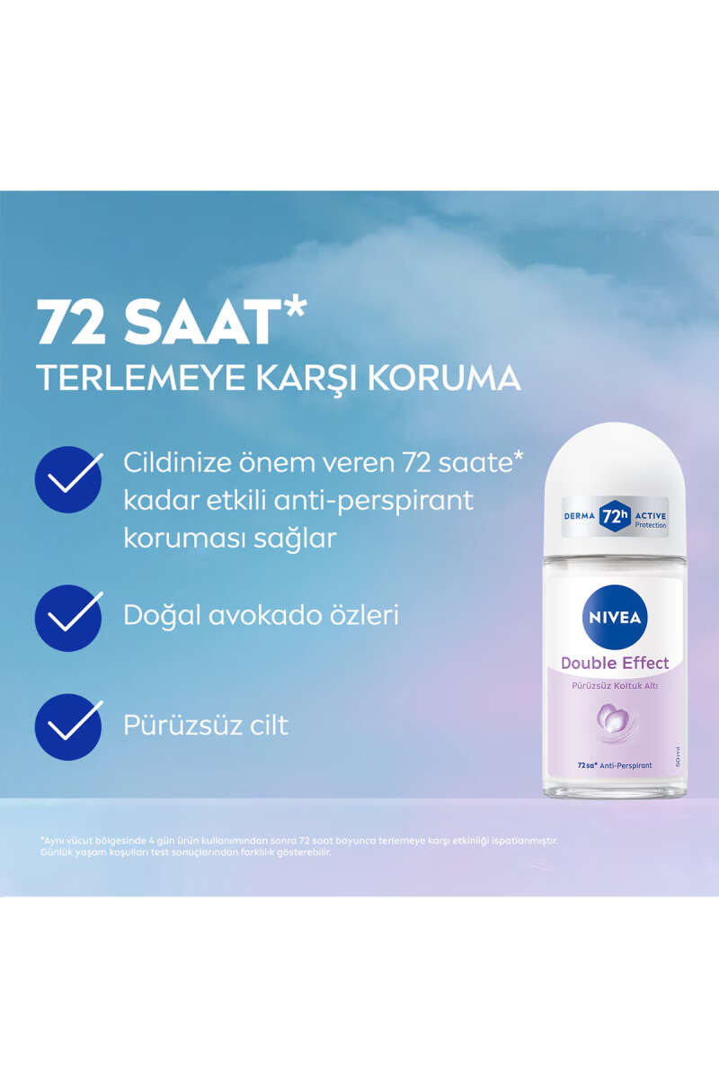 Nivea Double Effect, size tek üründe iki büyük avantaj sunar. İçeriğindeki değerli Doğal Avokado Özleri sayesinde hem cildinizi besleyip yumuşatır hem de koltuk altı tüylerinin görünümünü azaltarak daha uzun süreli pürüzsüzlük hissi yaşatır.