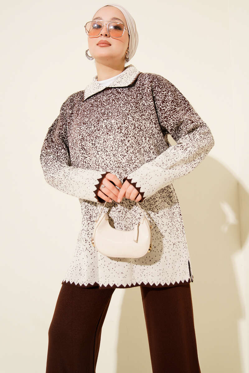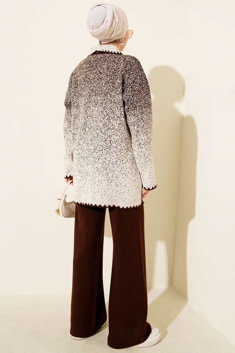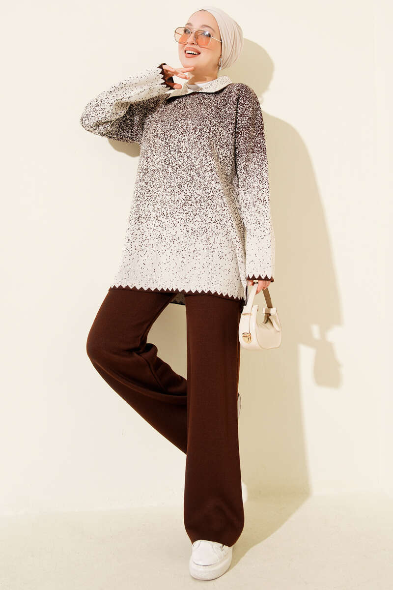 Yarım Fermuarlı Yatay Çizgili Triko İkili Takım Kahve