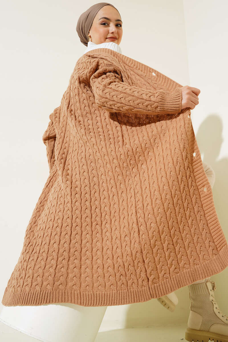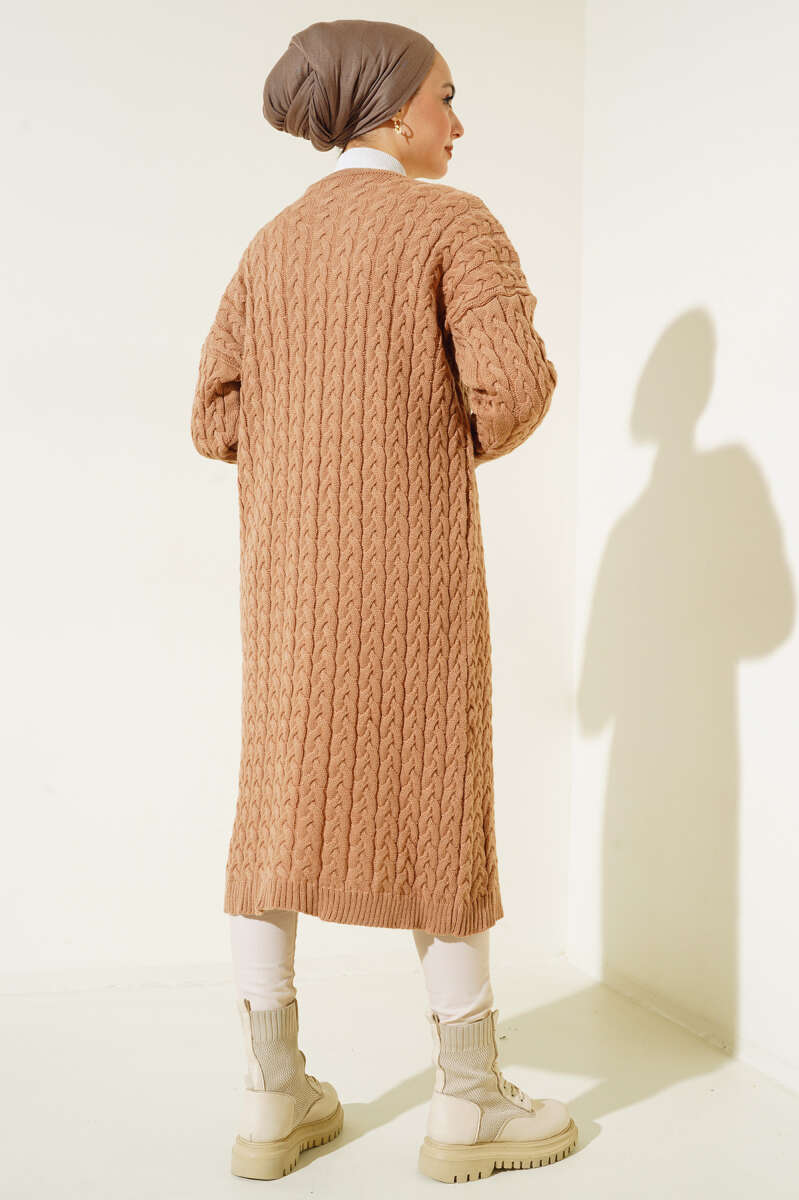 Boydan Düğmeliæ Sepet Örgü Uzun Hırka Haki