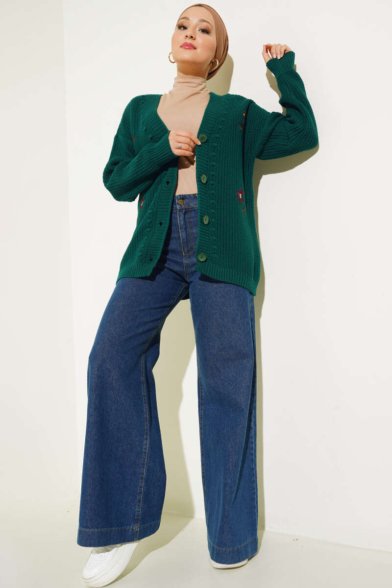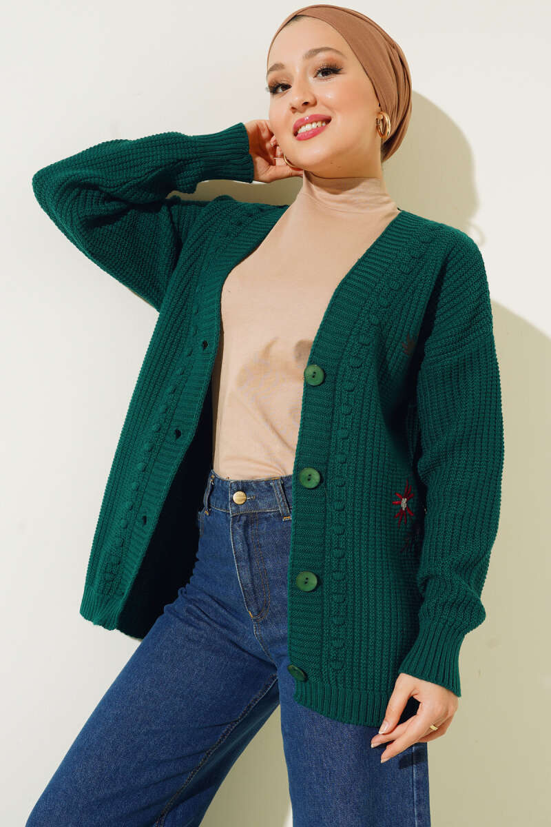 Nakış İşlemeli Düğmeli Triko Hırka Nefti