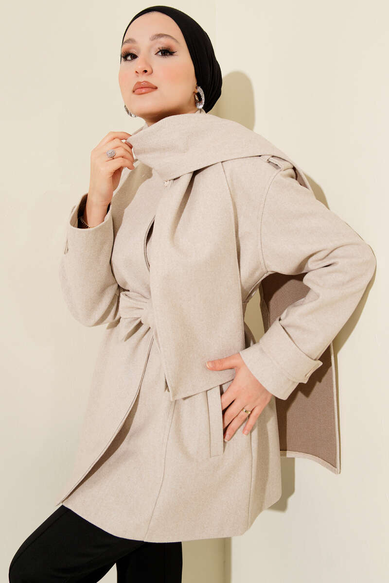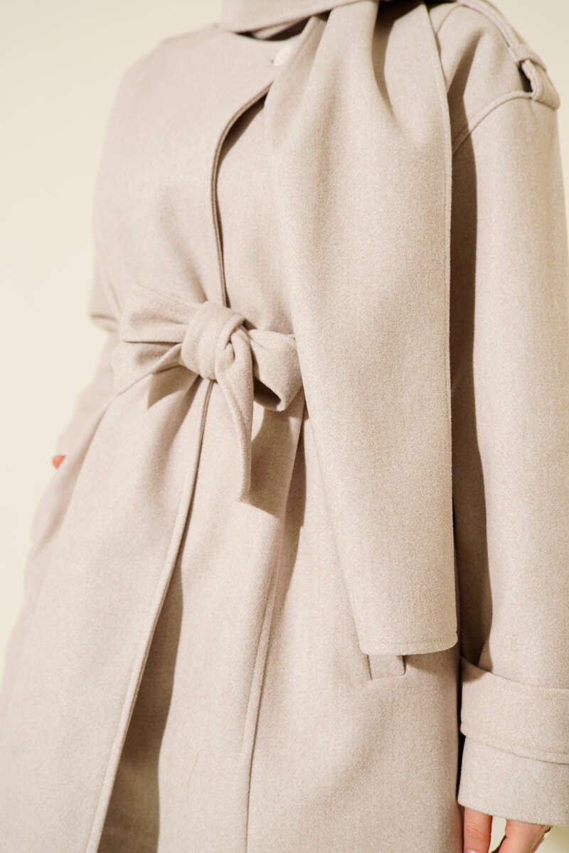 Bebe Yaka Kuşaklı Kaşe Kaban Bej