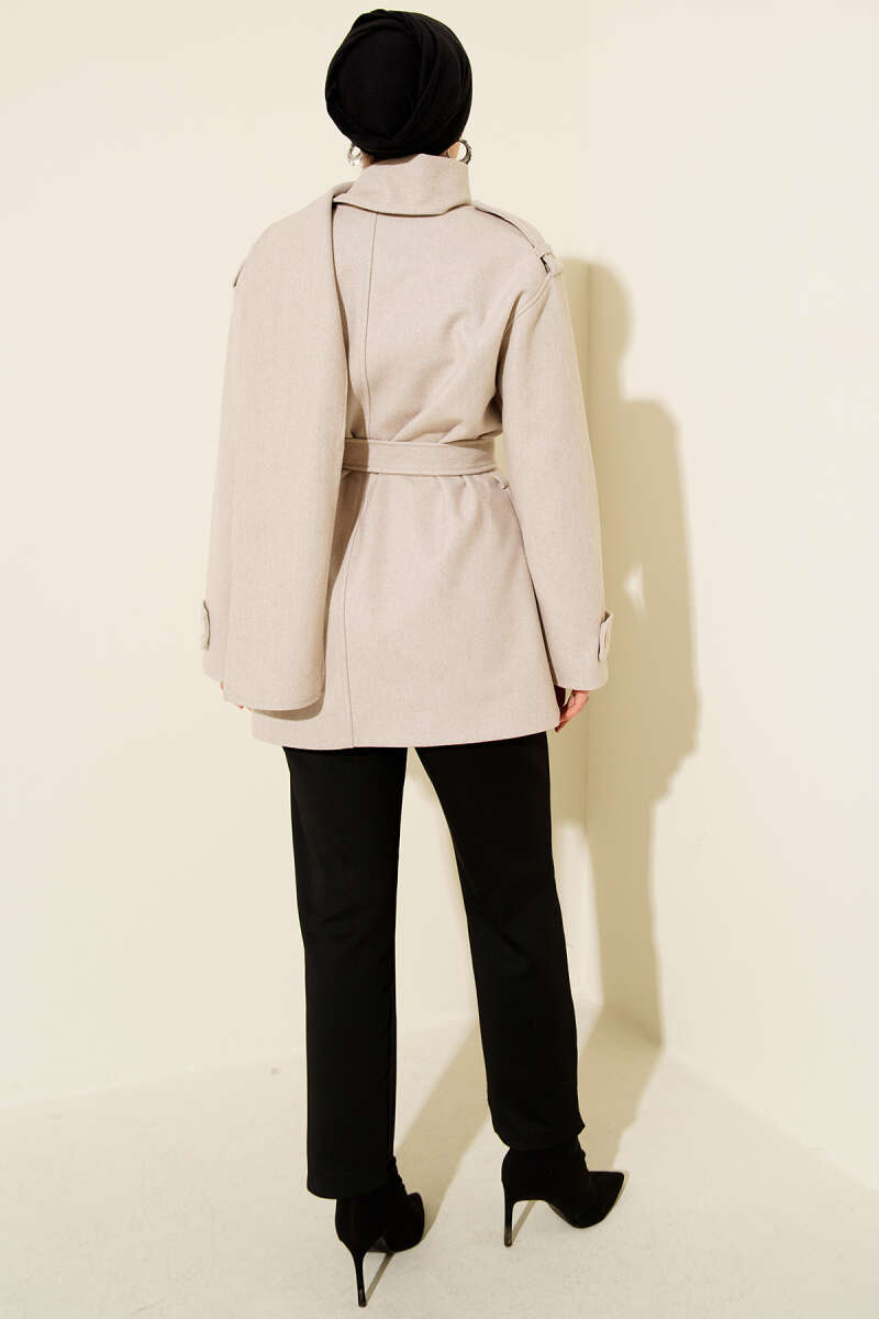 Omuz Apoletli Atkılı Kaşe Kaban Bej