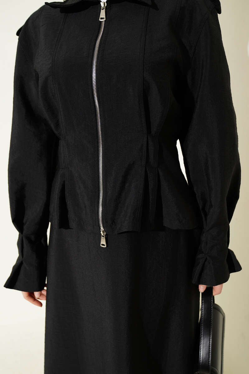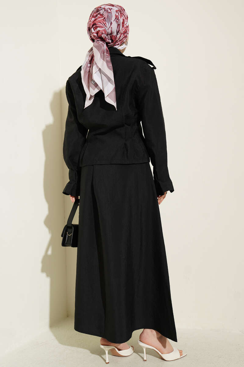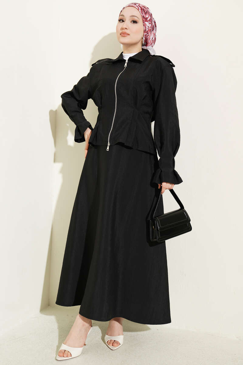 Omuzlardaki apolet detayları ve beldeki pensli kesimiyle maskülen ve feminen çizgileri ustalıkla harmanlayan bu takım, otoriter ve şık bir duruş sergiler. Fermuarlı ceket yapısı kullanım kolaylığı sağlarken, aşağıya doğru zarifçe genişleyen kloş etek formu tasarıma hareketli ve asil bir hava katar. Işıltılı ve dokulu kumaşı sayesinde özel davetlerden resmi ortamlara kadar geniş bir kullanım yelpazesi sunan bu ikili, silüetinizi kusursuz bir şekilde ortaya çıkarır. Modern kalıbı ve dikkat çekici detaylarıyla gardırobunuzun en iddialı ve zamansız setlerinden biri olmaya adaydır.