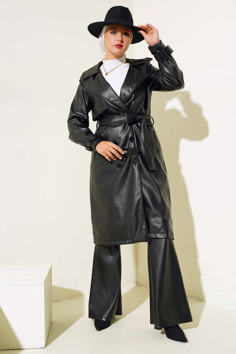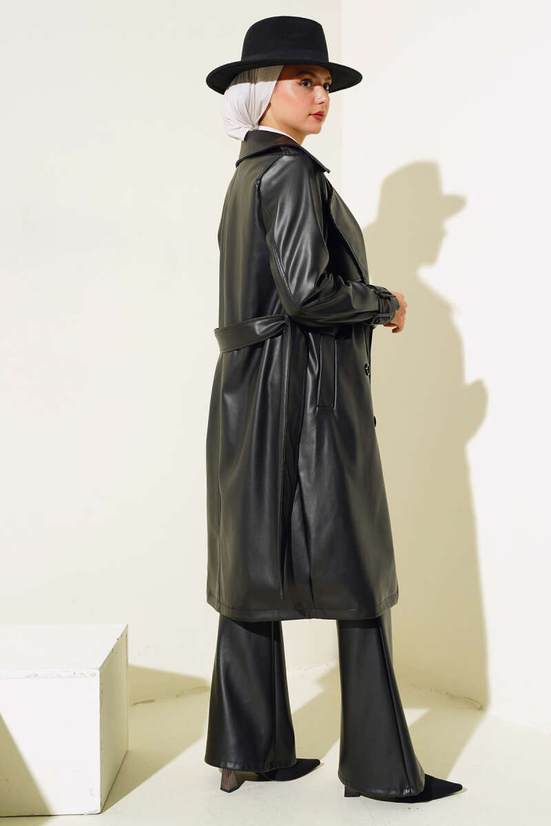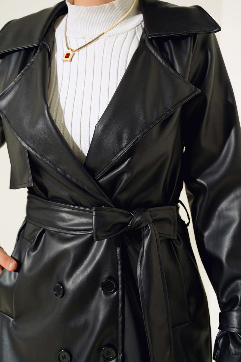 Kruvaze Yaka Kuşaklı Kısa Deri Trençkot Siyah
