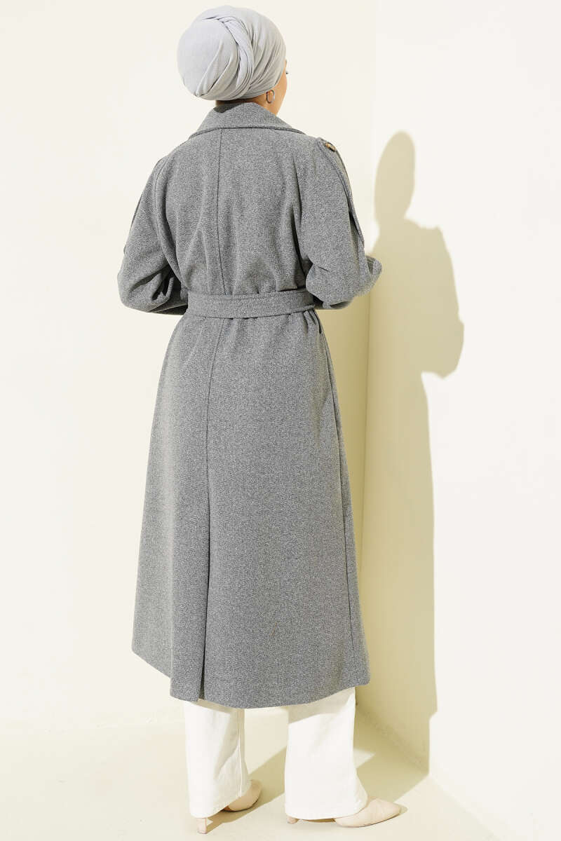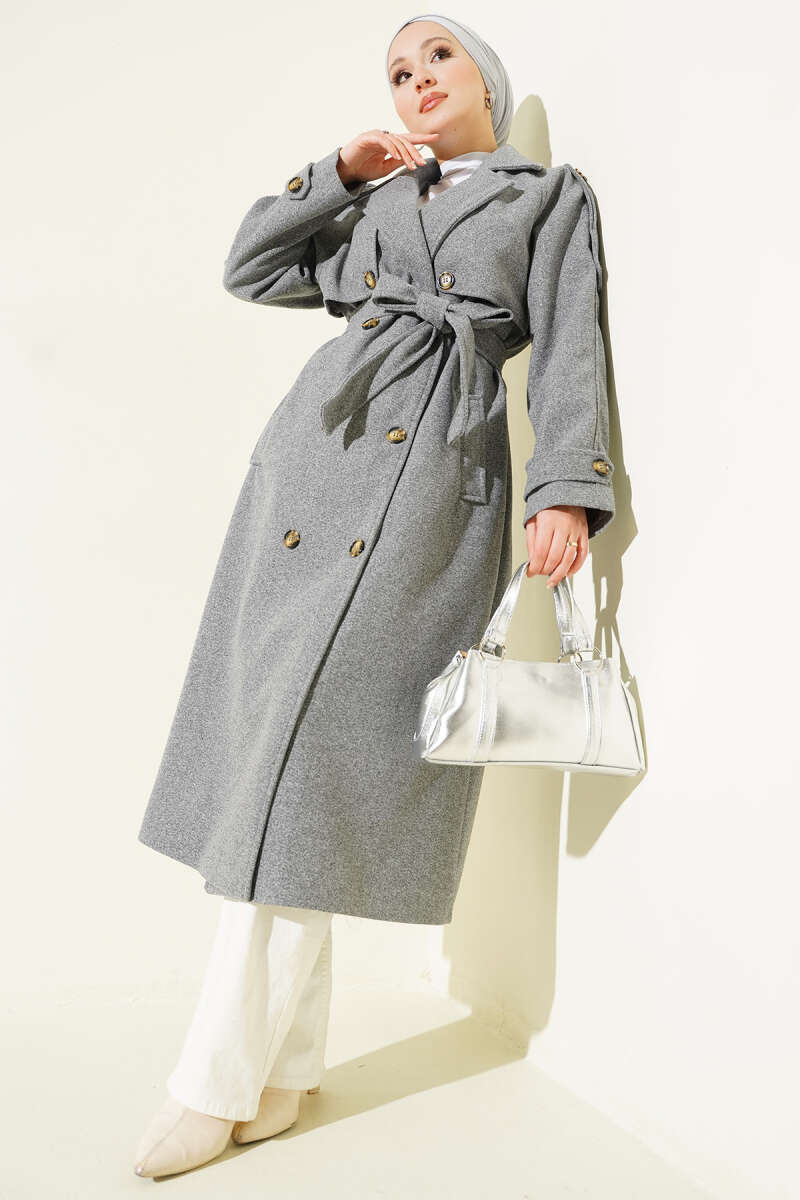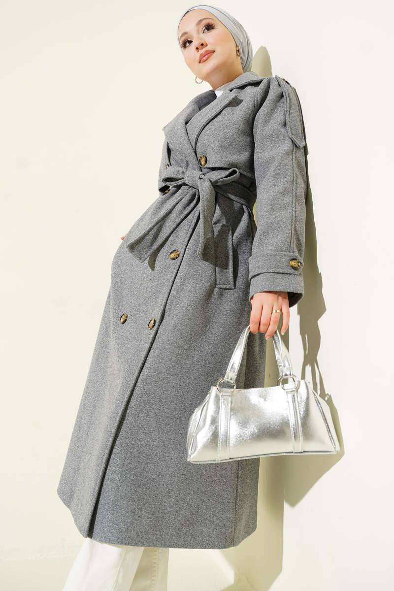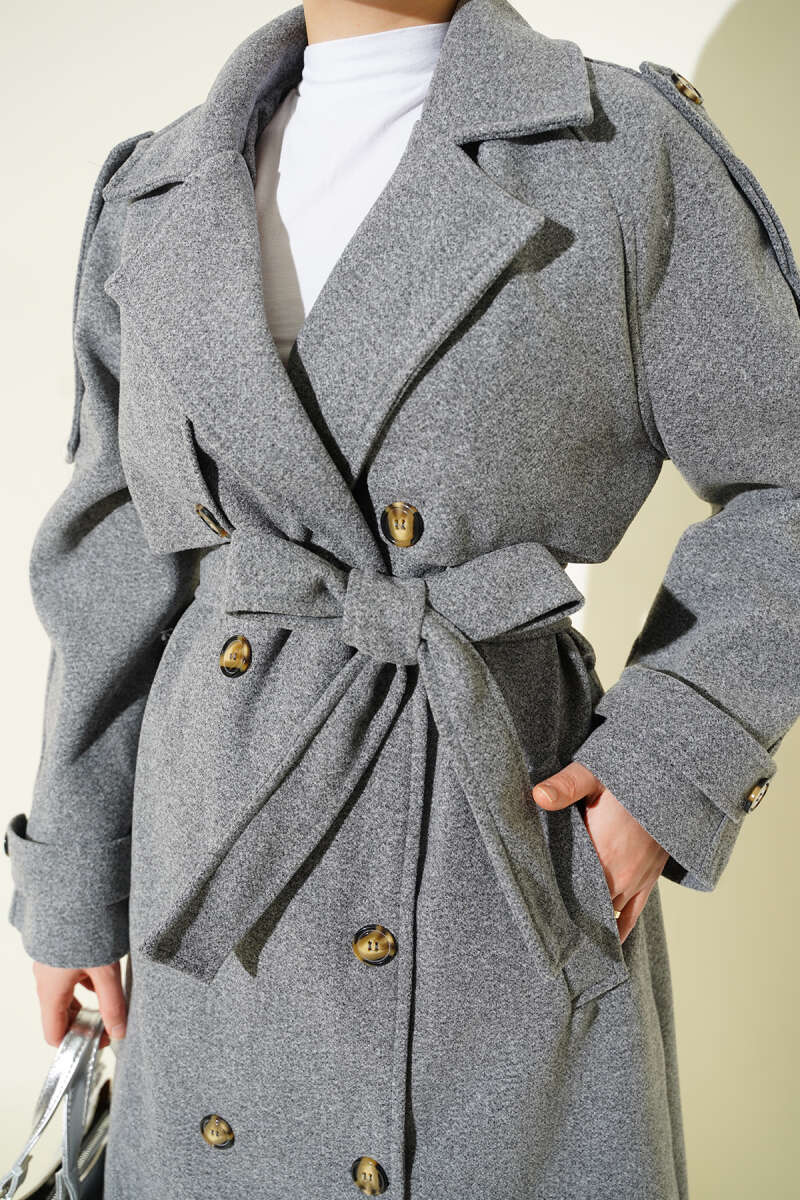 Kuşaklı Gold Düğmeli Kaşe Kaban Gri
