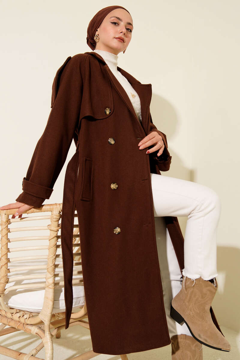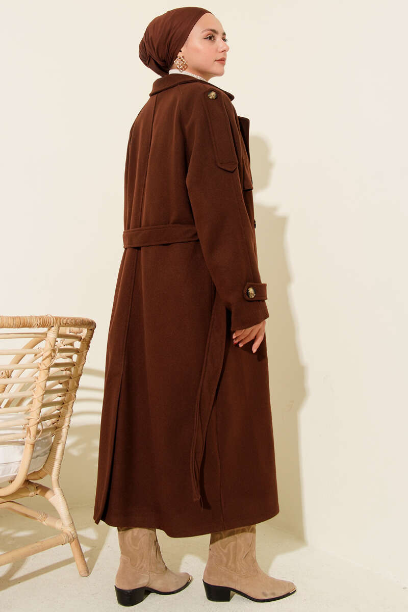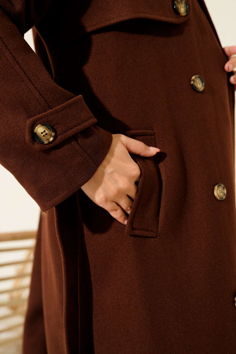 Kruvaze Yakalı Kuşaklı Uzun Kaşe Kaban Kahve