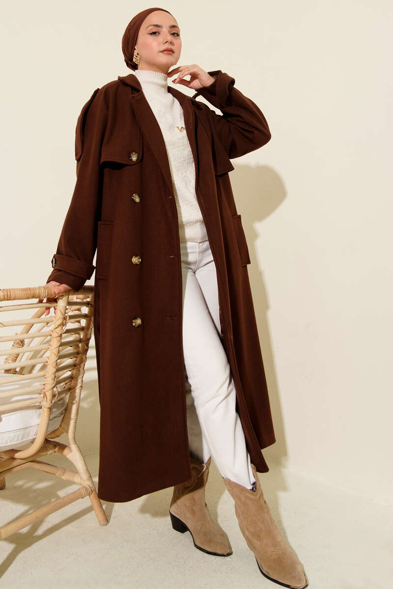 Omuz Apoletli Düğme Detaylı Kaşe Kaban Kahve