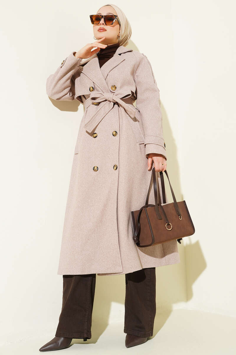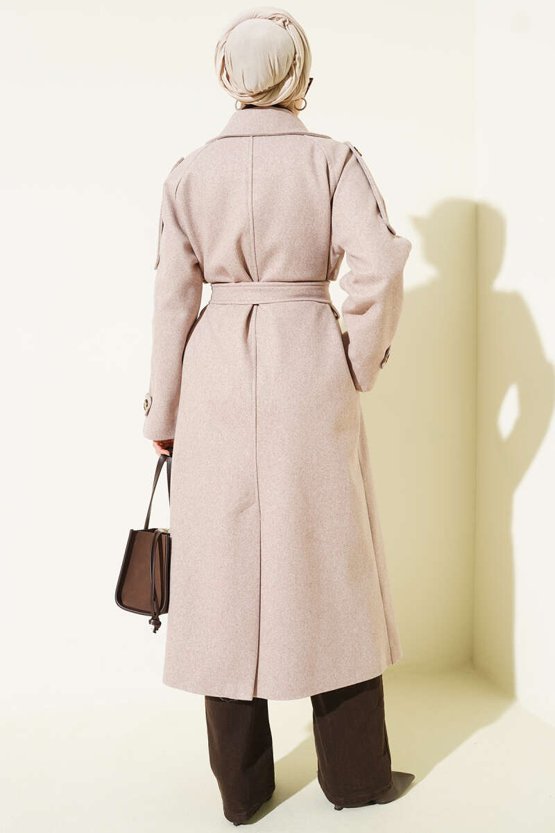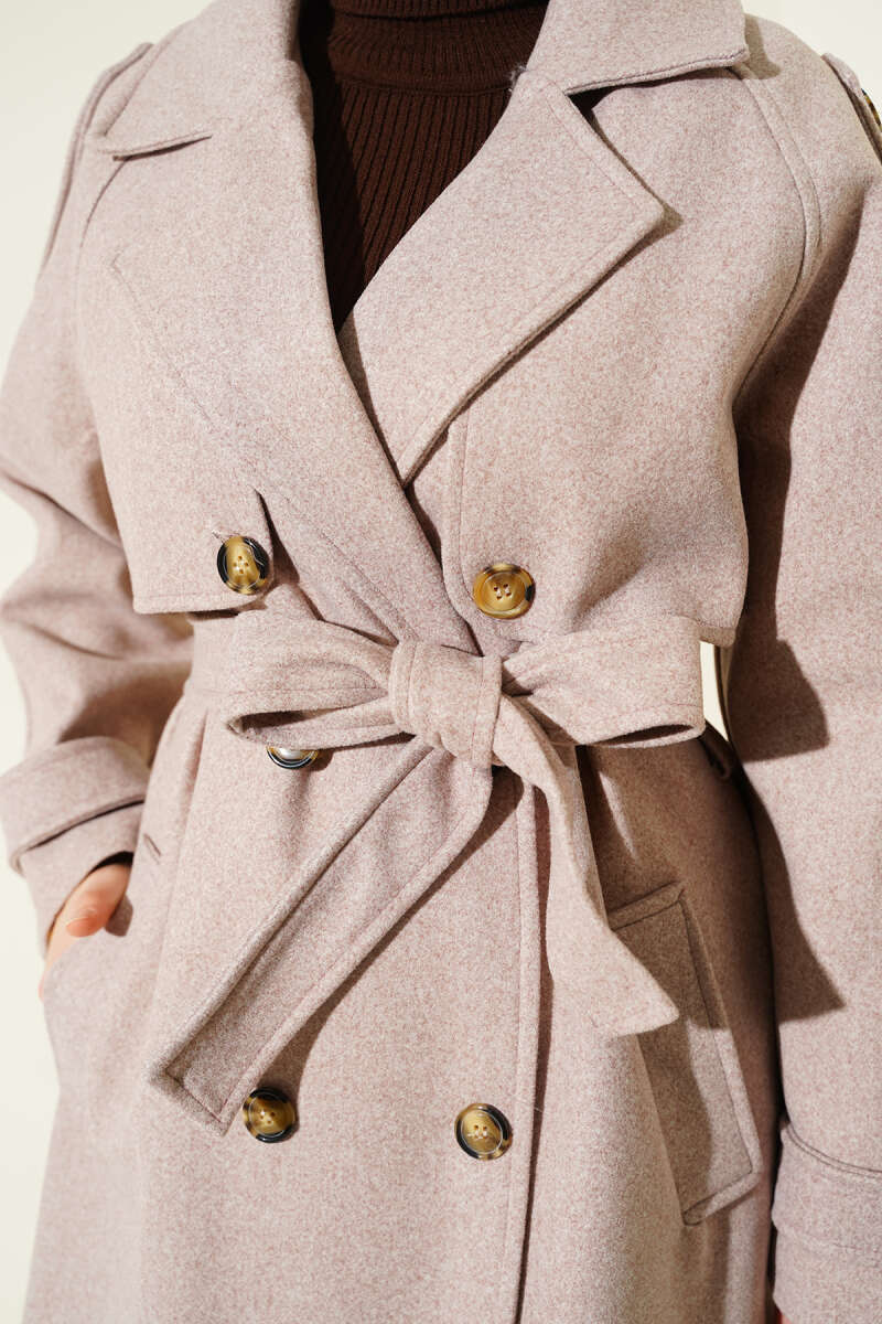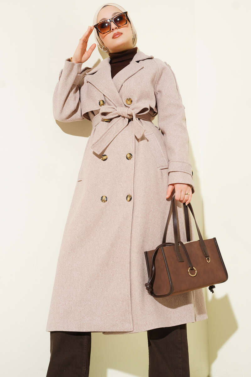 Kuşaklı Gold Düğmeli Kaşe Kaban Vizon