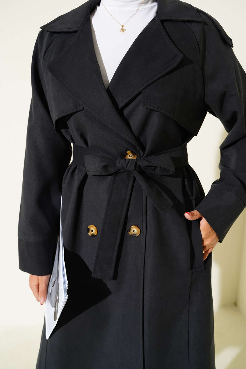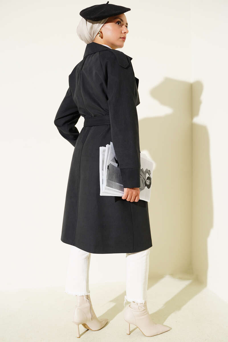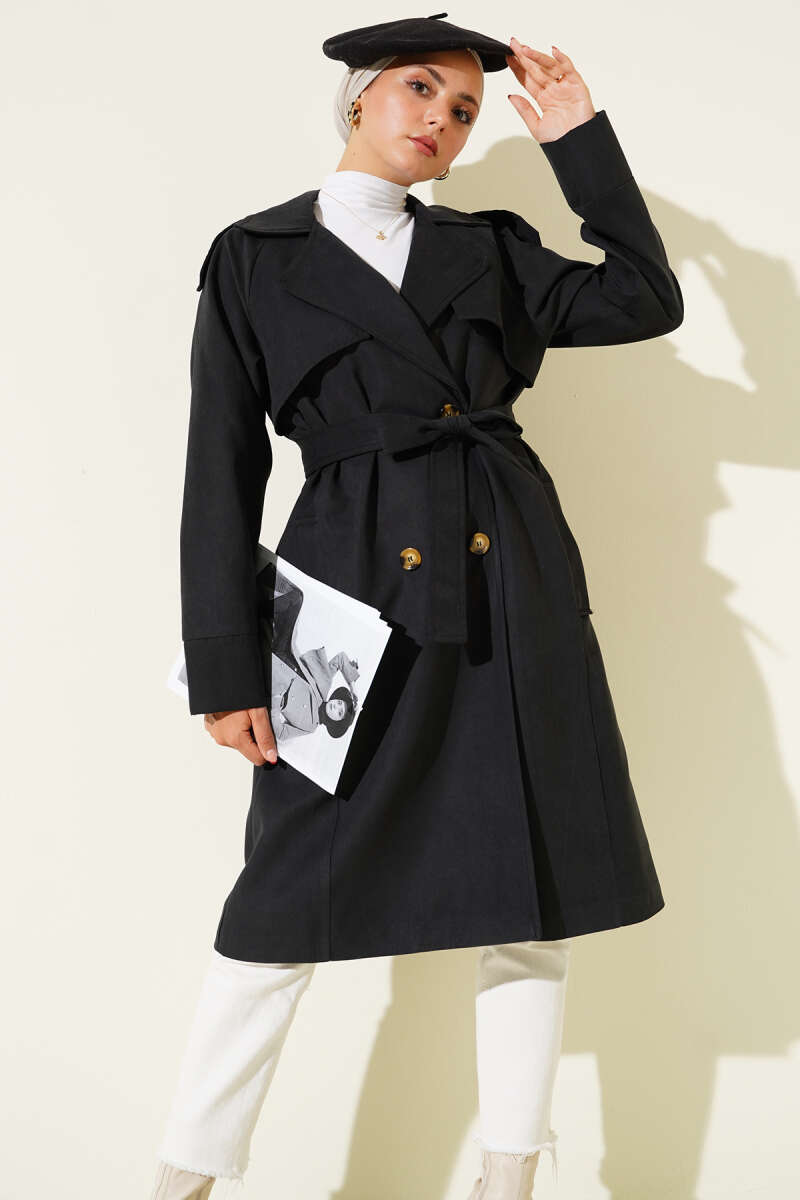 Omuz Apoletli Düğme Detaylı Trençkot Siyah