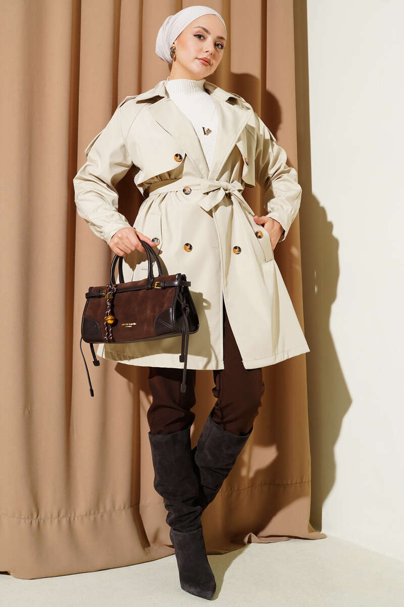 Omuz Apoletli Düğmeli Astarsız Trençkot Kahve