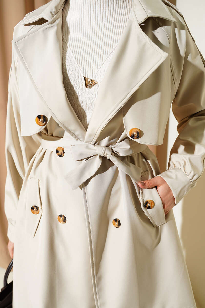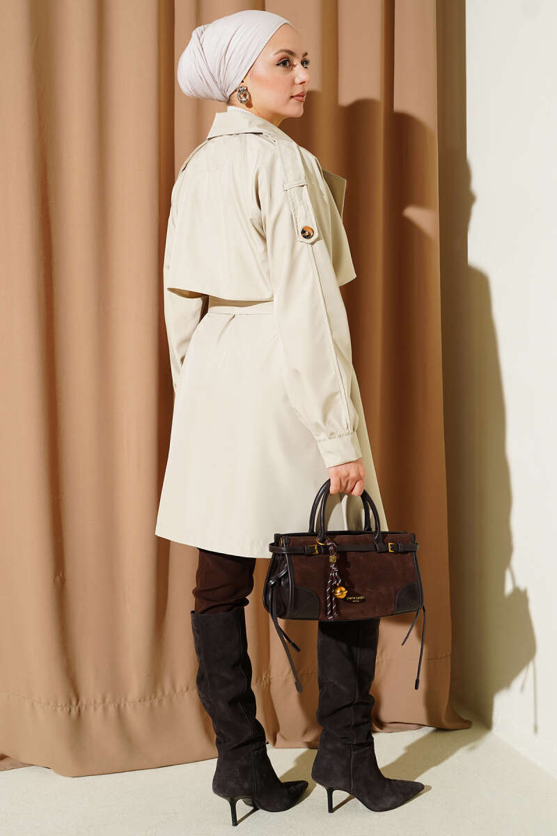 Kruvaze Yaka Kuşaklı Kısa Deri Trençkot Bej
