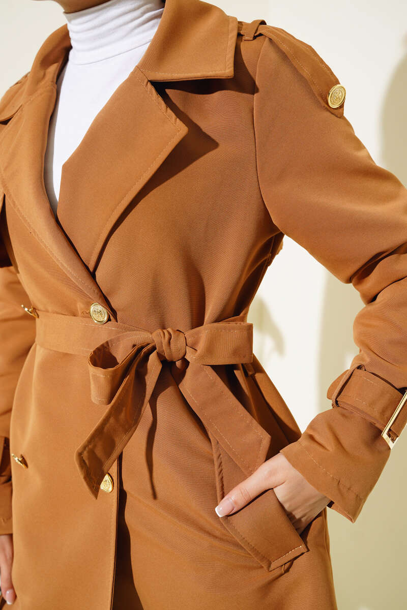 Omuz Apoletli Kısa Trençkot Taba