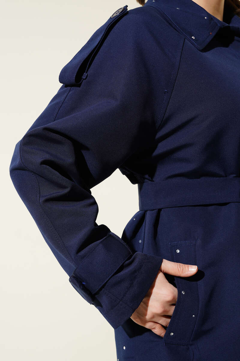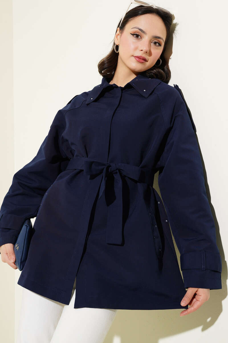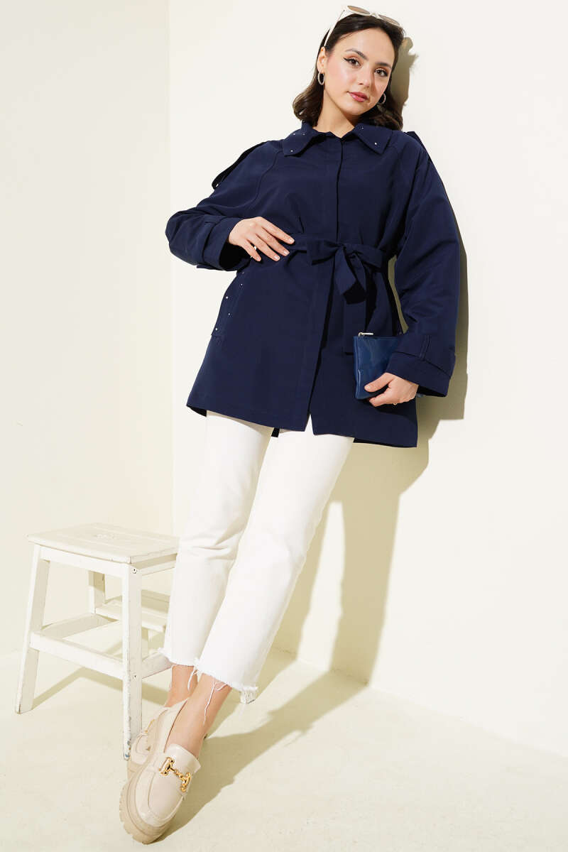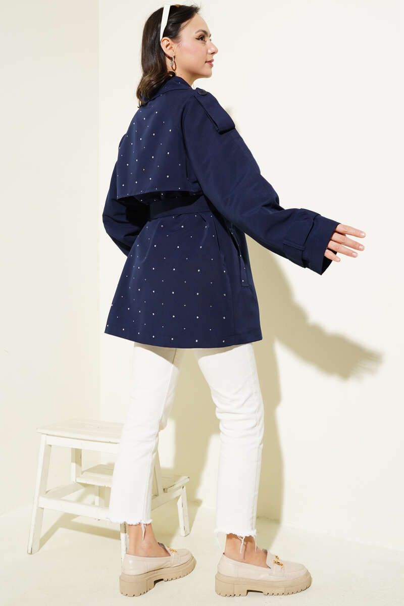Omuz Apoletli Kuşaklı Taş Detaylı Ceket Lacivert