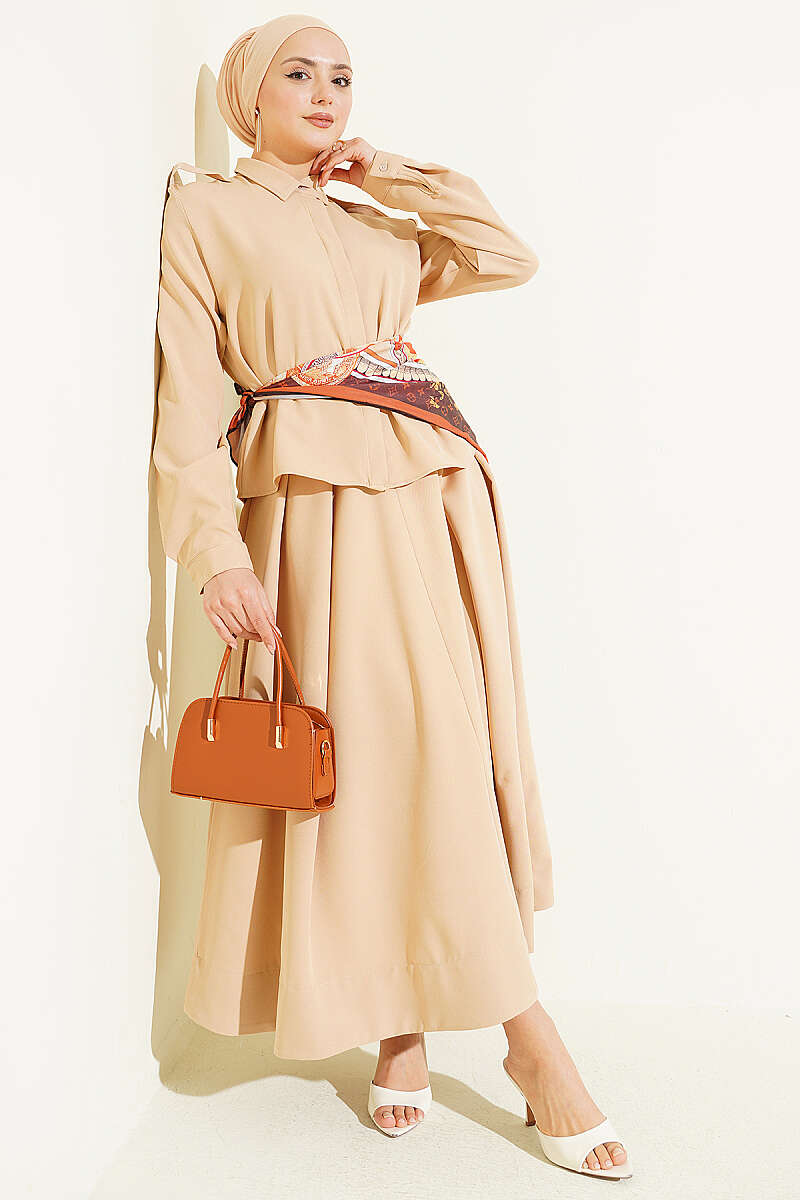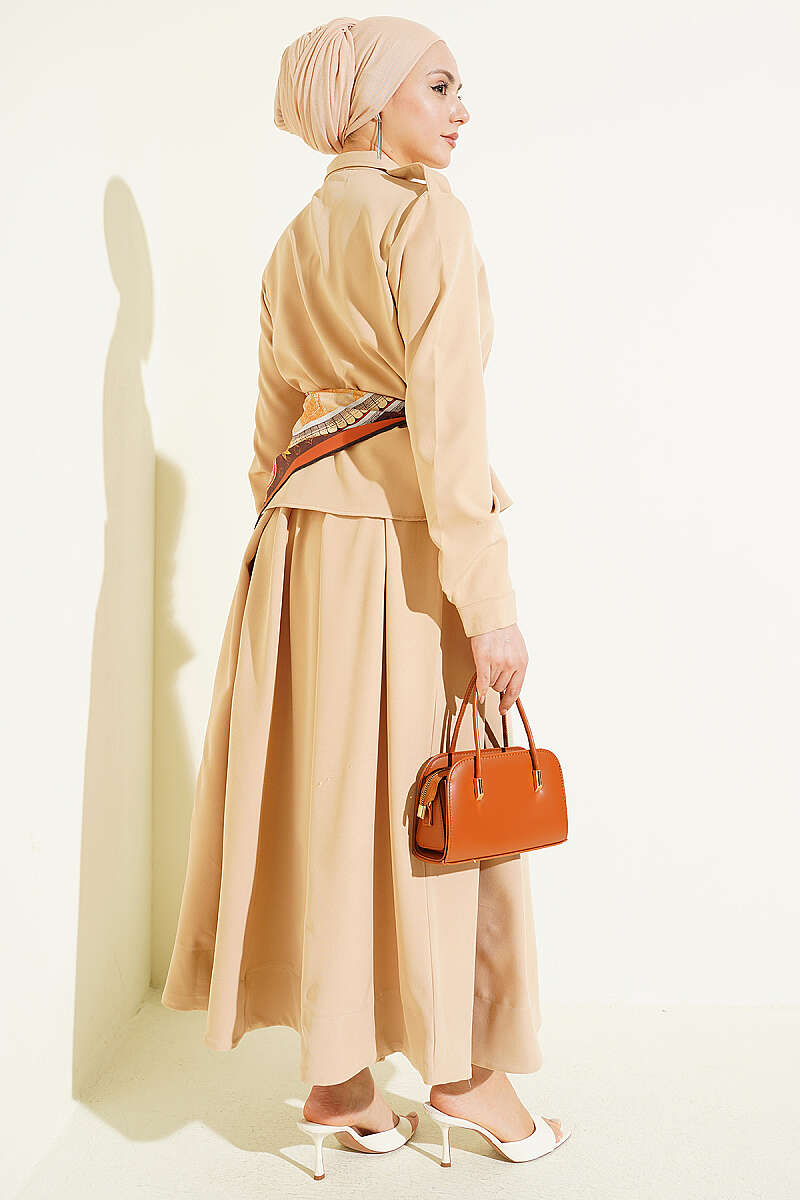 Omuz Apoletli Pileli Etekli İkili Takım Bej