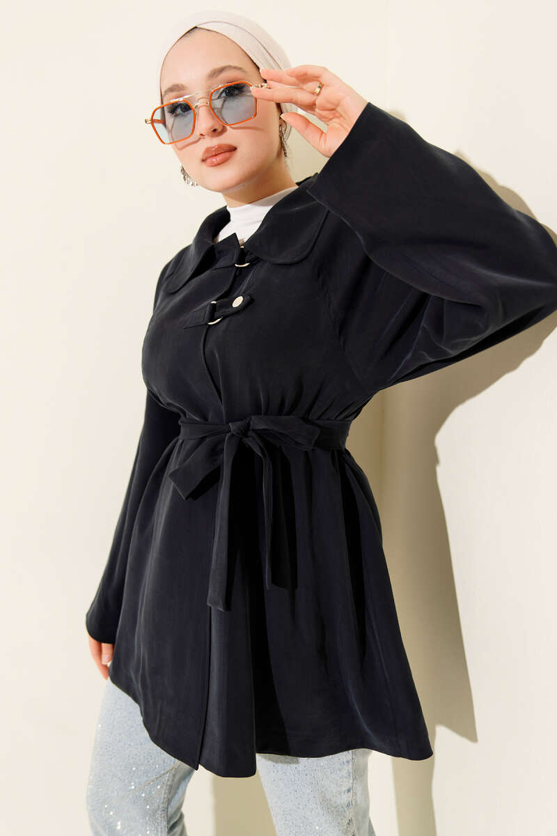 Kol Apoletli Kuşaklı Kot Trençkot Siyah