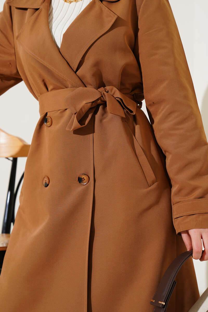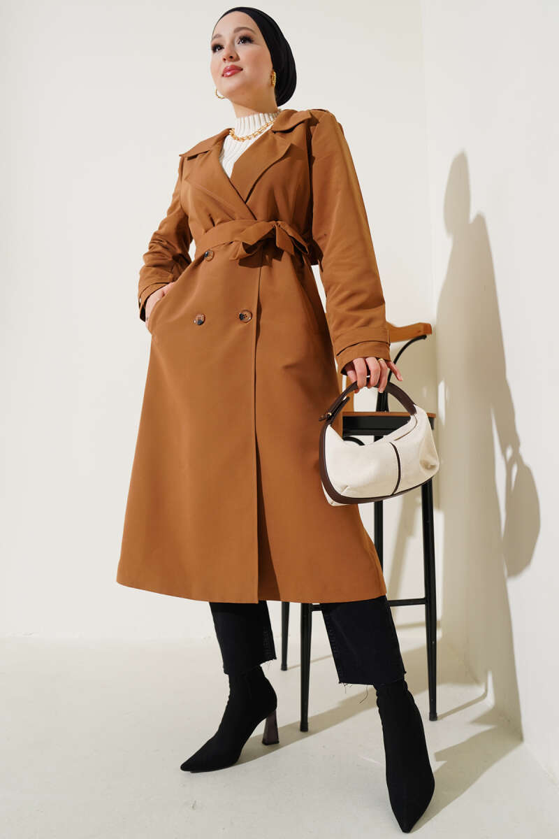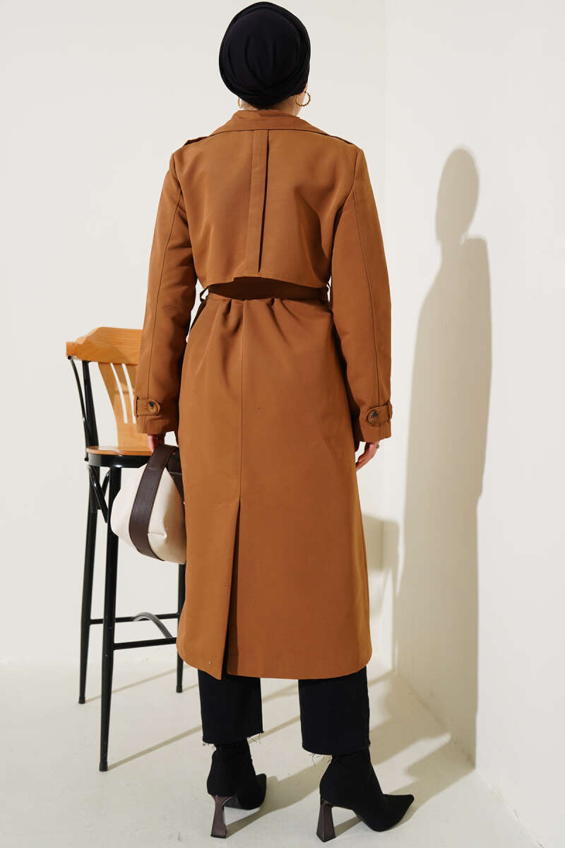 Omuz Apoletli Yırtmaç Detaylı Trençkot Taba