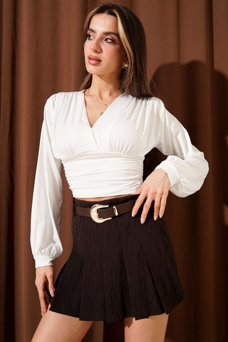 Bisiklet Yaka Tokalı Fitilli Bluz Beyaz