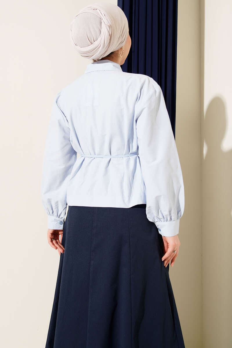 Omuz Büzgülü Kuşaklı Kısa Gömlek Lacivert