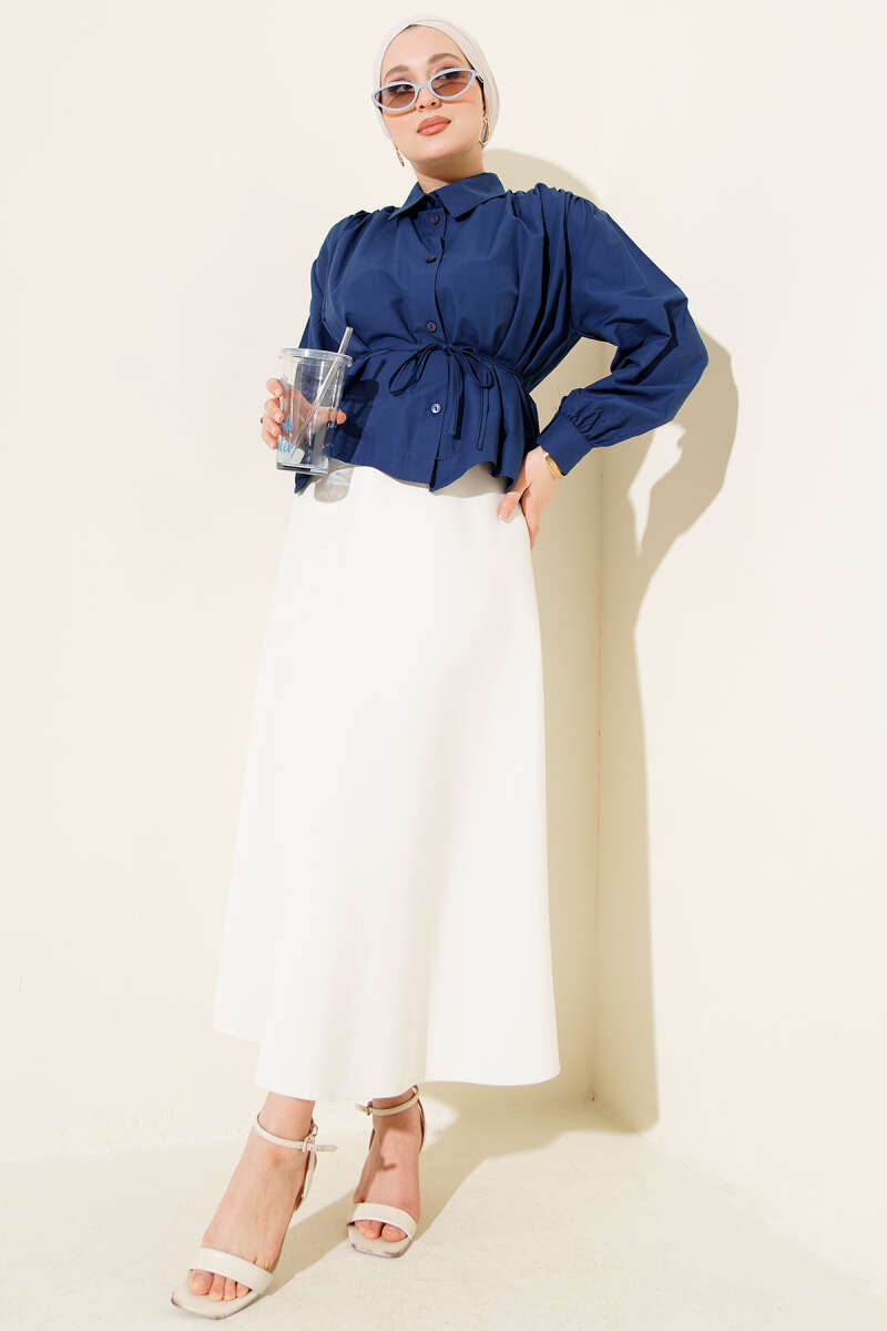 Omuz Büzgülü Kuşaklı Kısa Gömlek Ekru