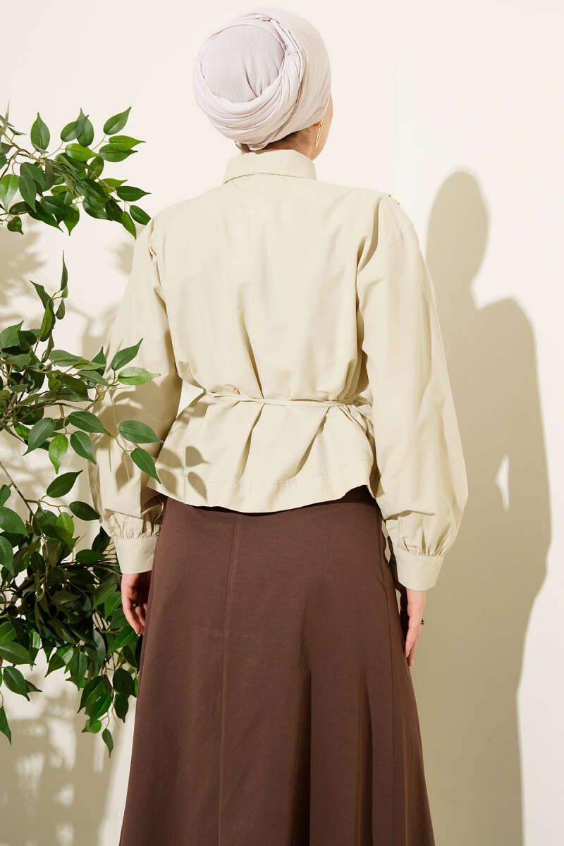 Omuz Büzgülü Kuşaklı Kısa Gömlek Ekru