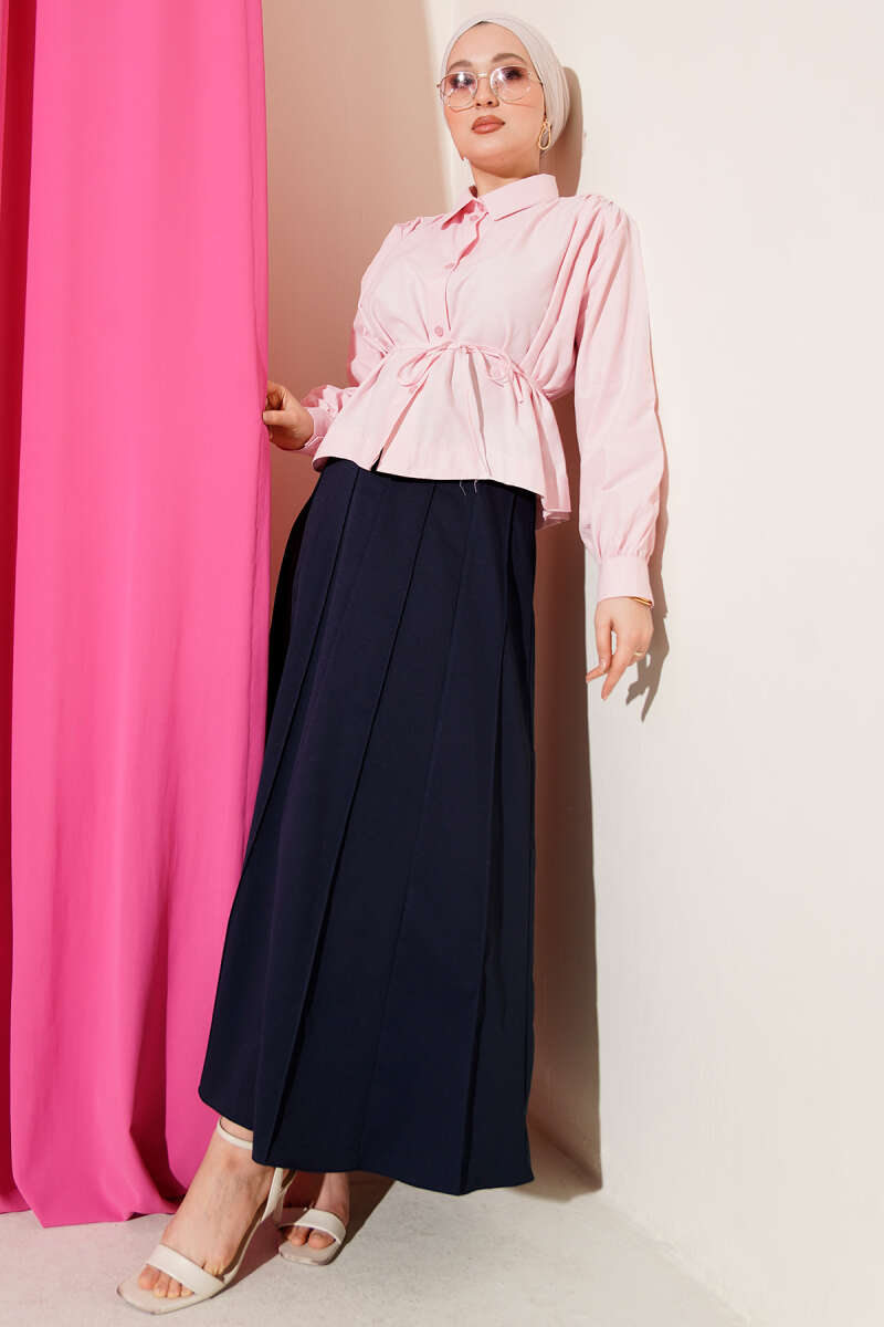 Omuz Büzgülü Kuşaklı Kısa Gömlek Lacivert
