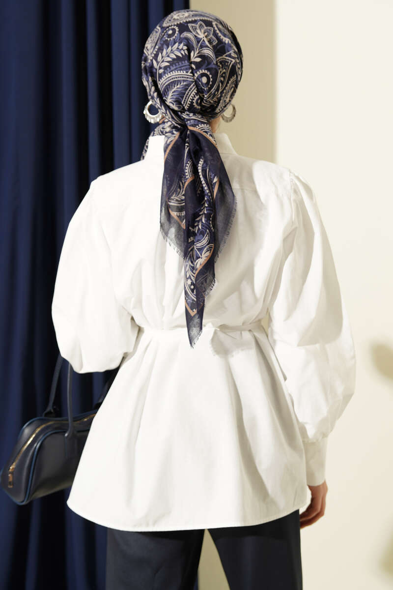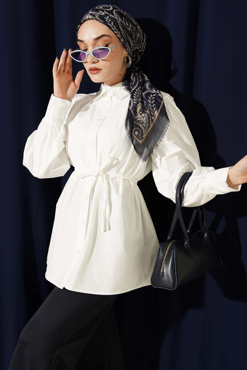Omuz Büzgülü Kuşaklı Poplin Gömlek Ekru