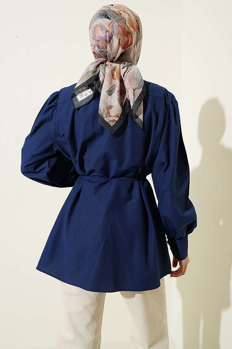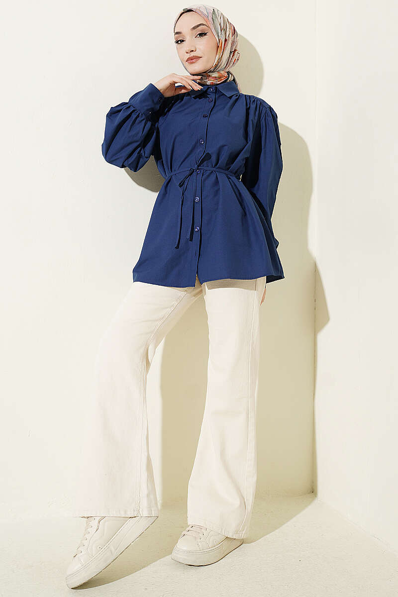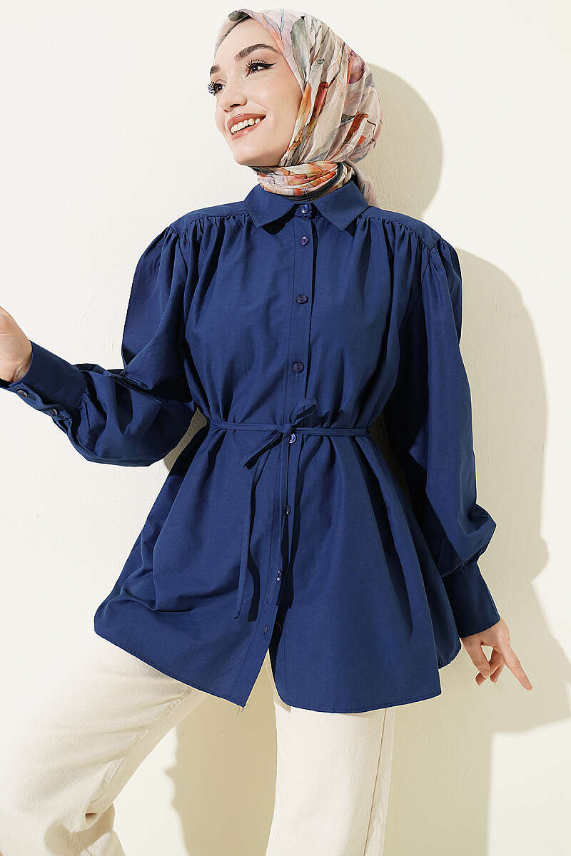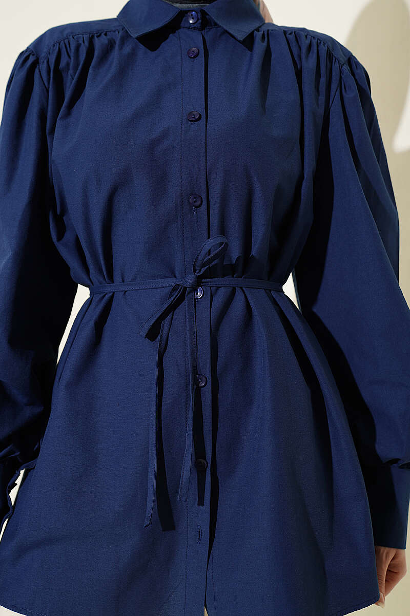 Omuz Büzgülü Kuşaklı Poplin Gömlek Lacivert