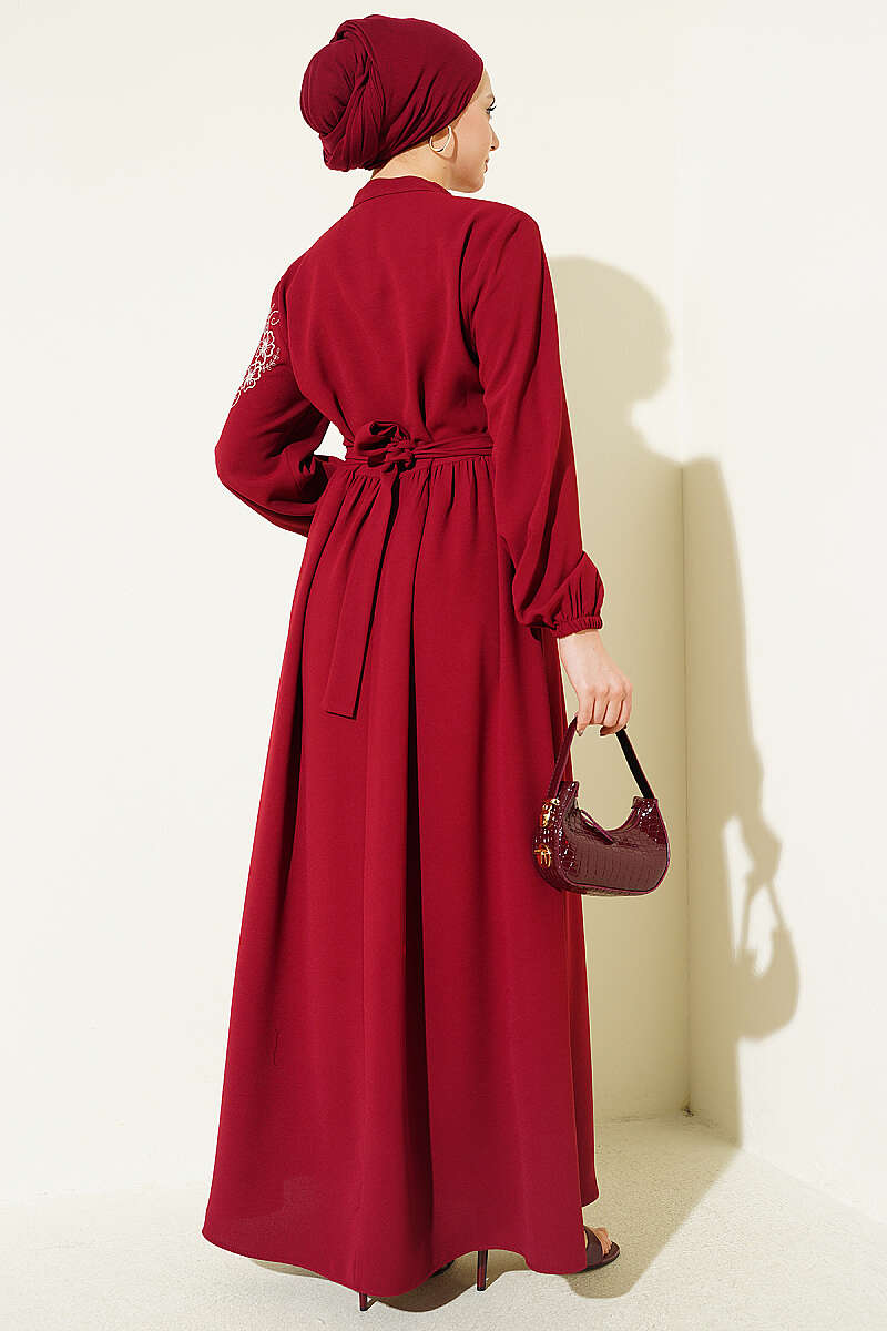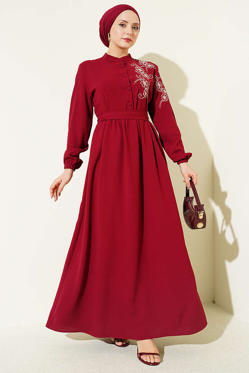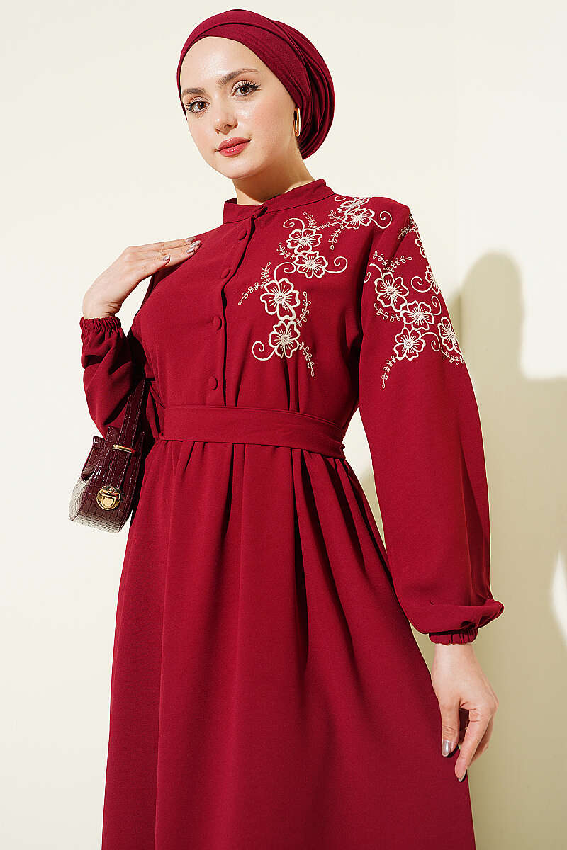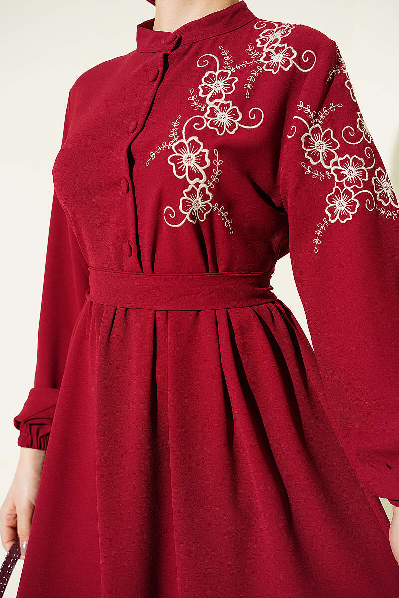 Omuz Çiçek Nakışlı Düğmeli Elbise Bordo
