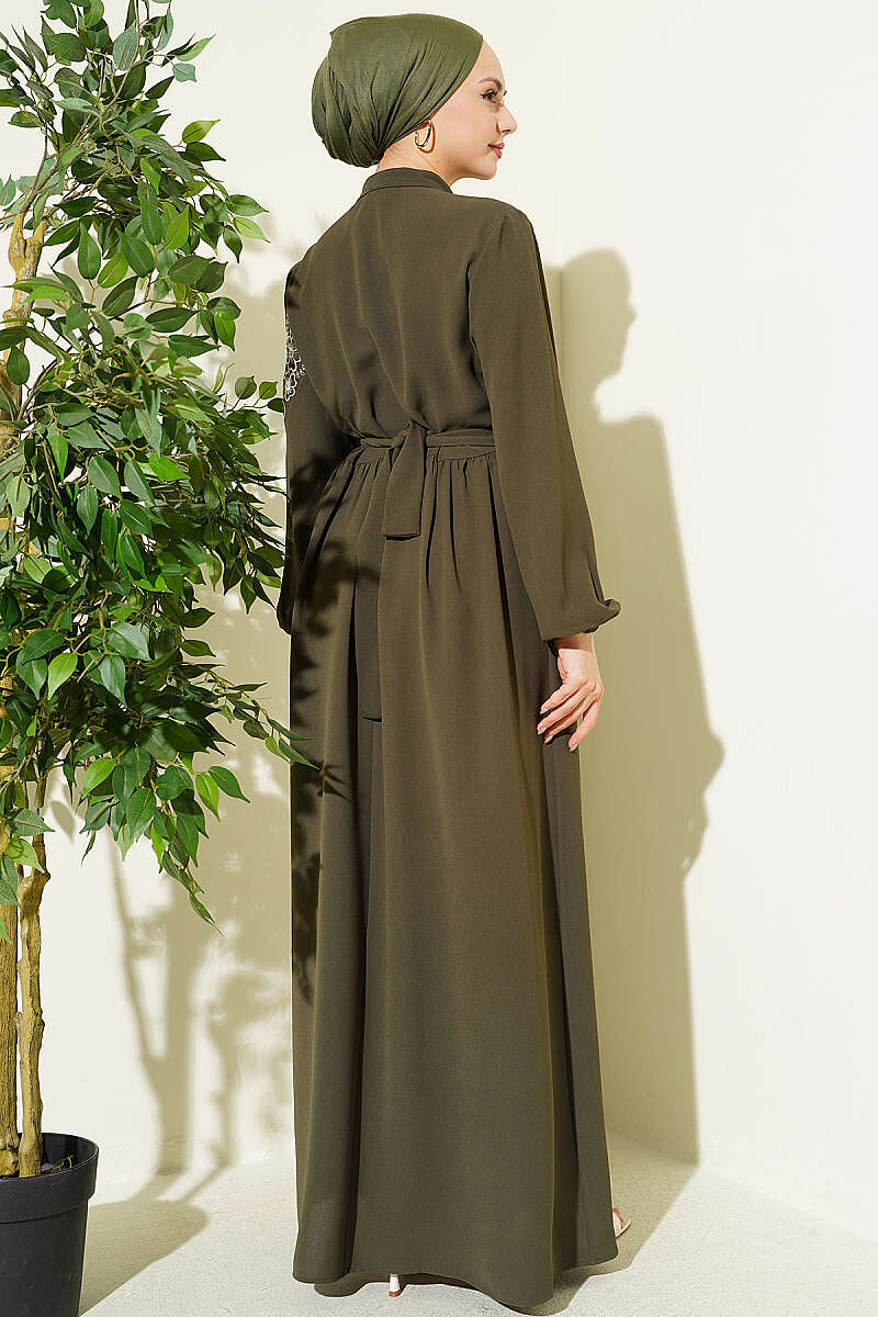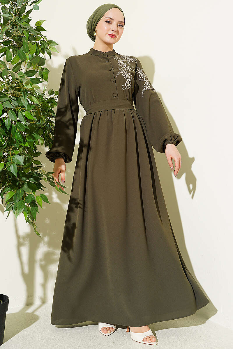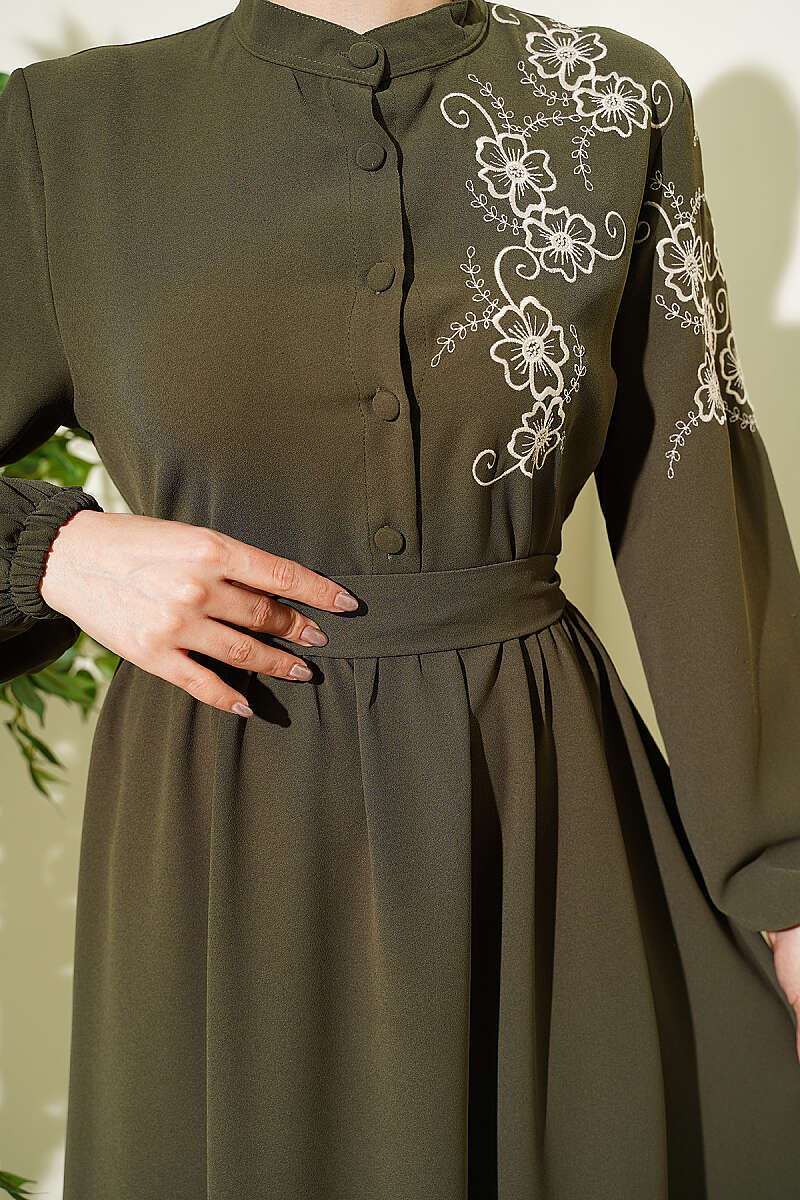 Omuz Çiçek Nakışlı Düğmeli Elbise Haki