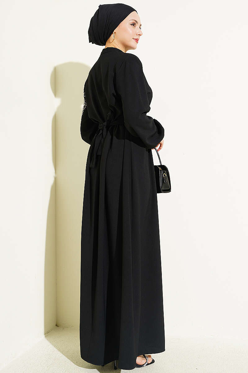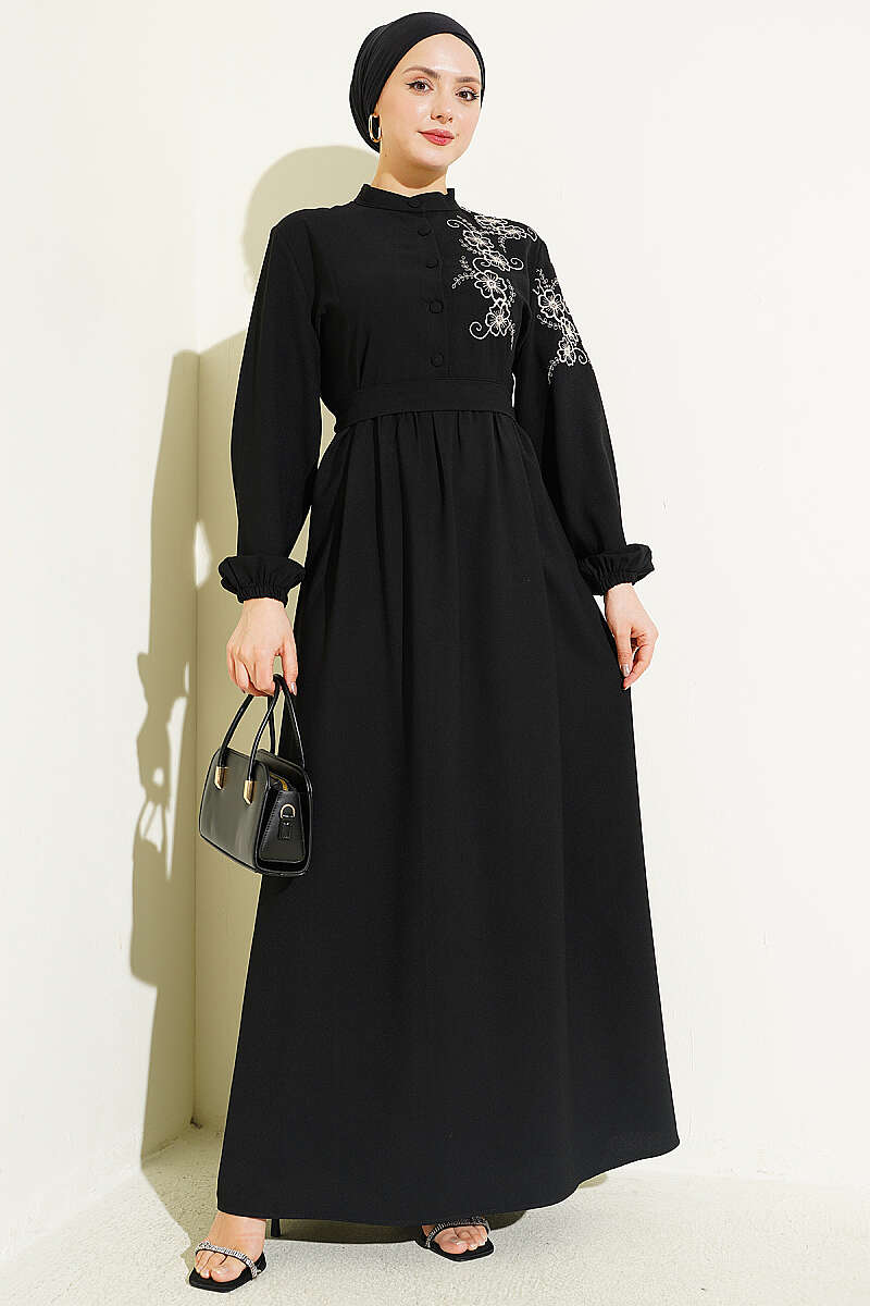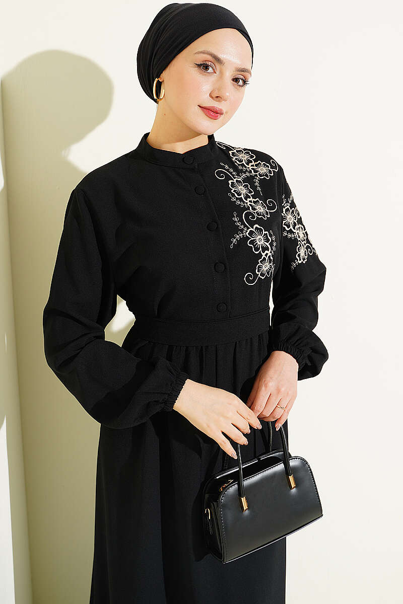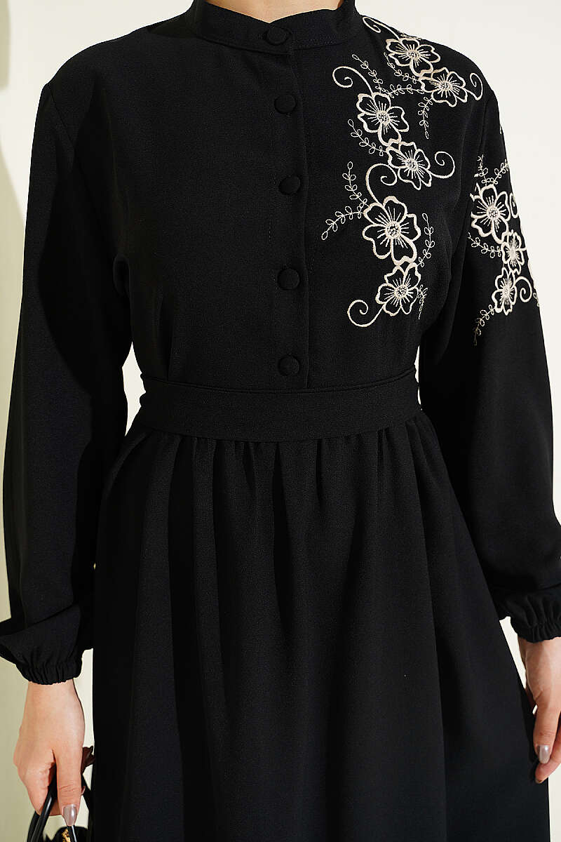 Omuz Çiçek Nakışlı Düğmeli Elbise Siyah