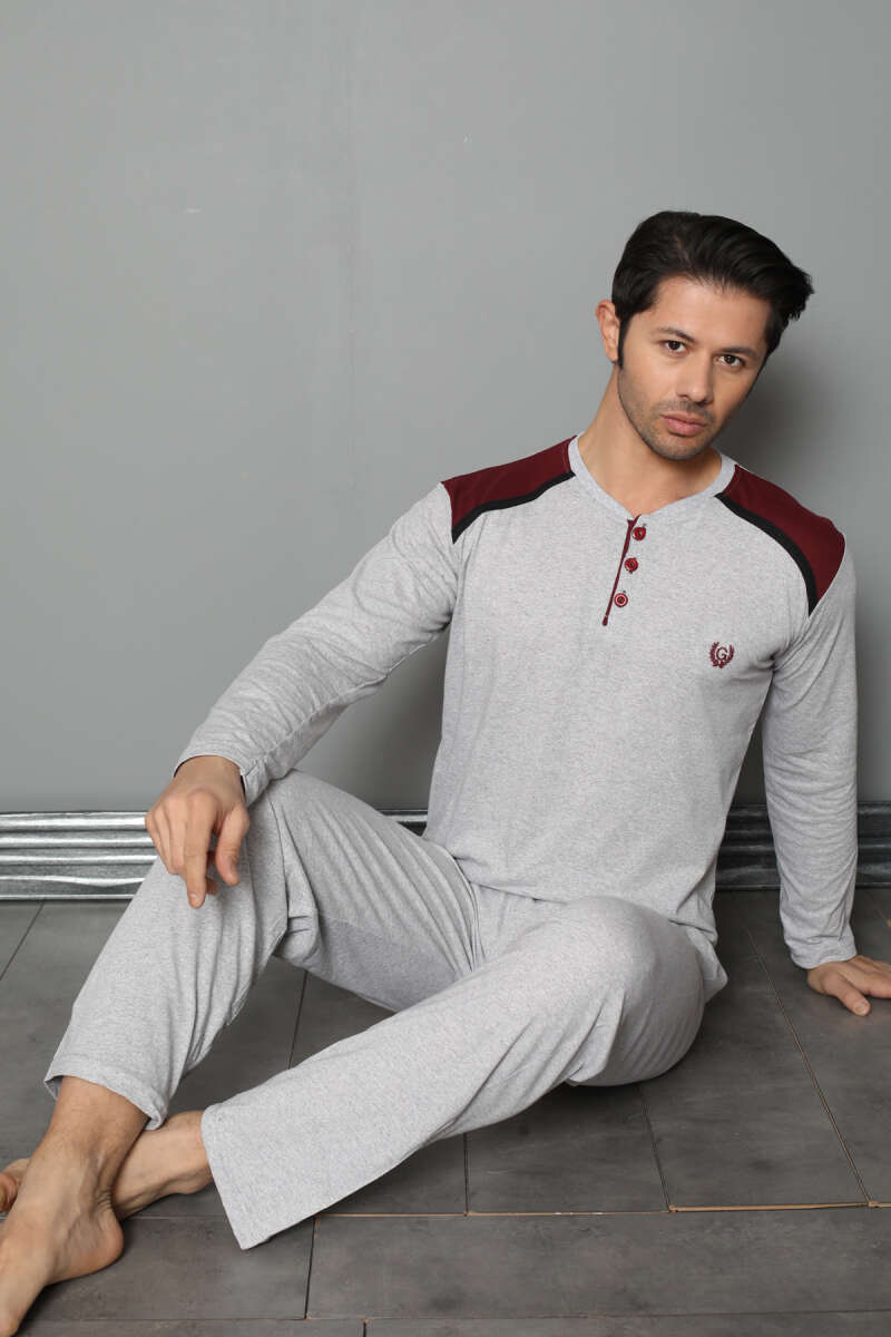 Omuz Düğmeli Uzun Kol Erkek Pijama Takım Gri