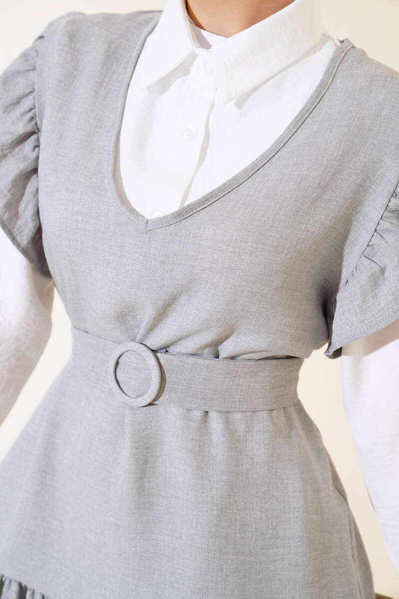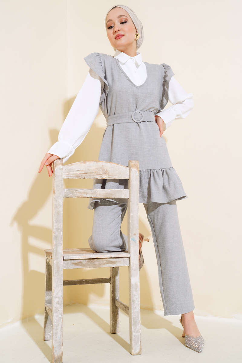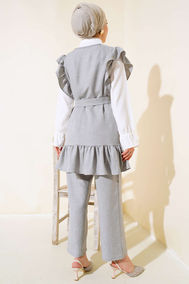 Omuz Fıfırlı Üçlü Keten Takım Gri