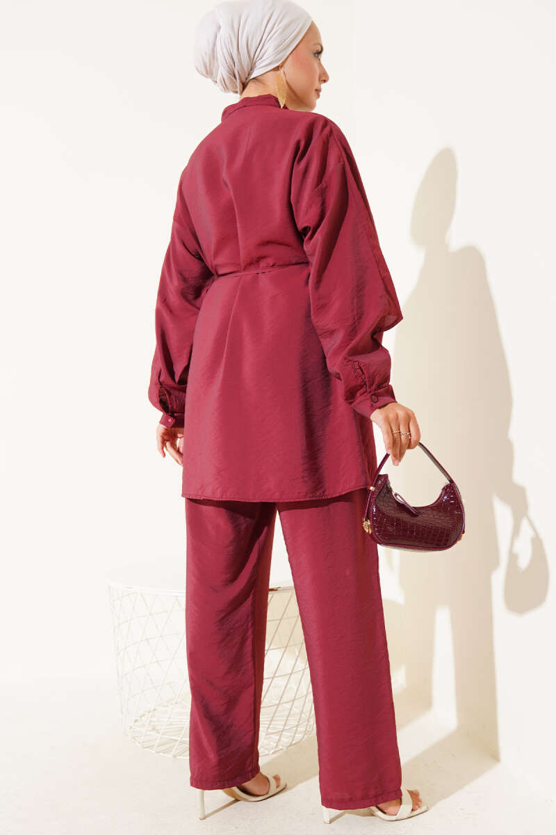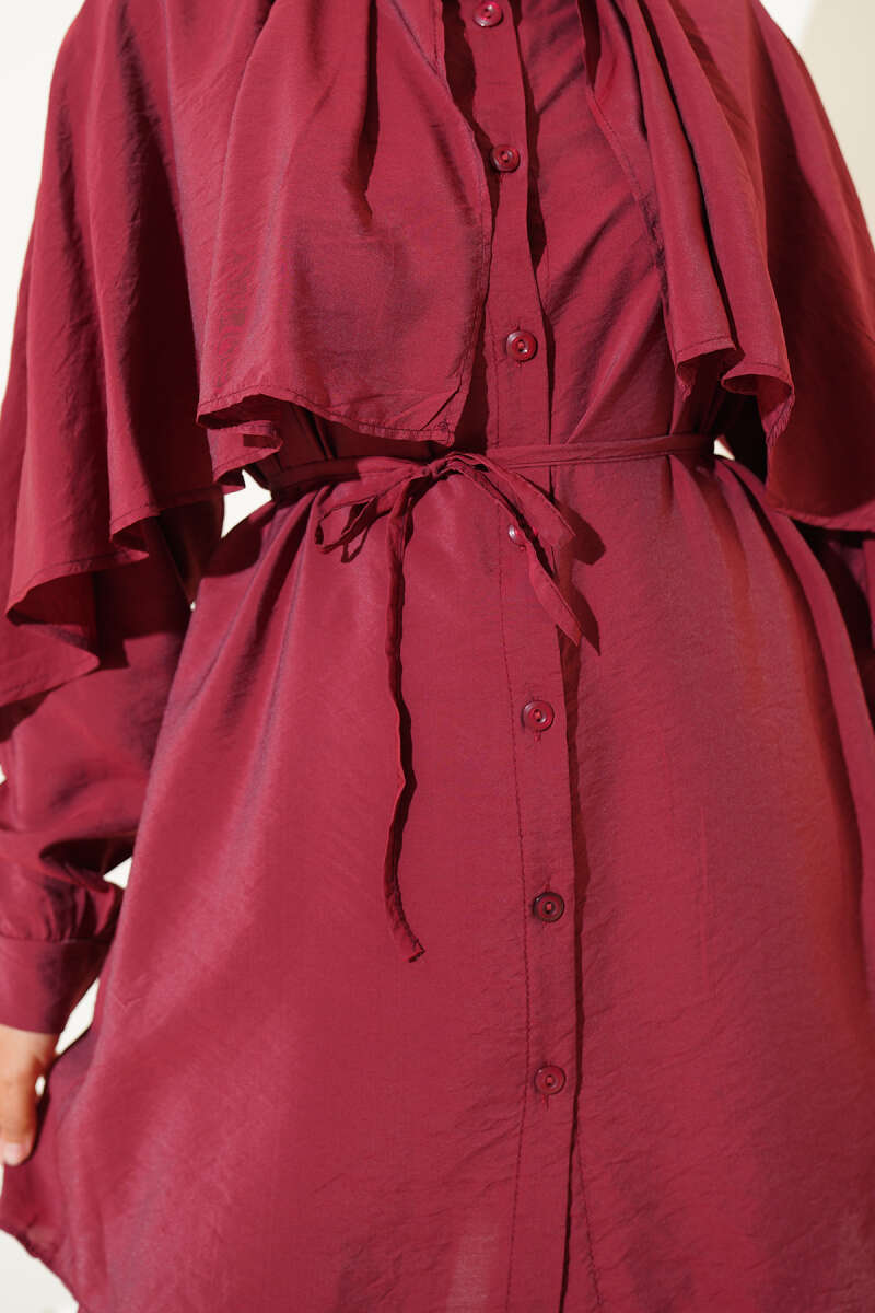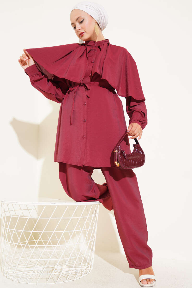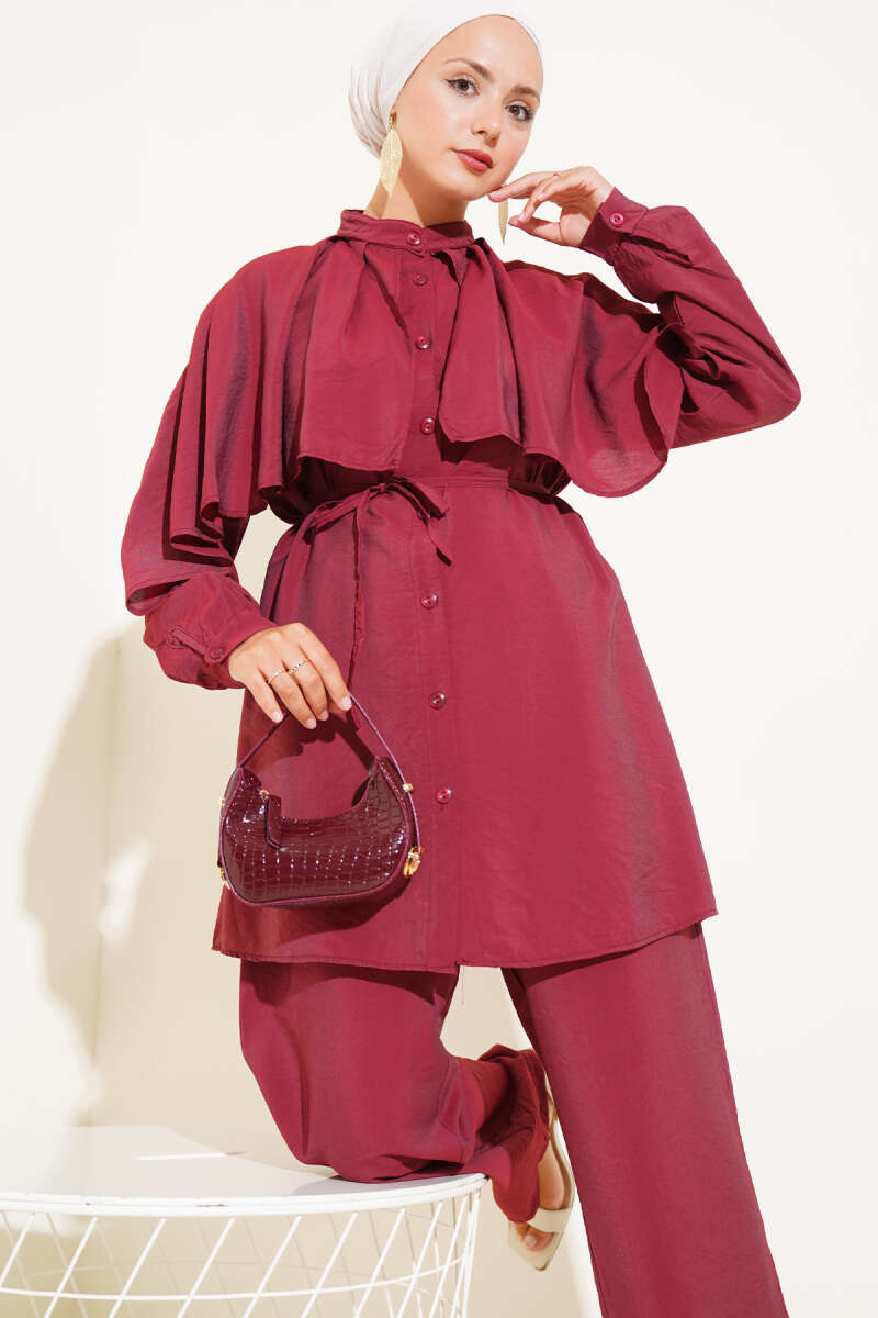 Omuz Fırfır Pelerinli İkili Takım Bordo