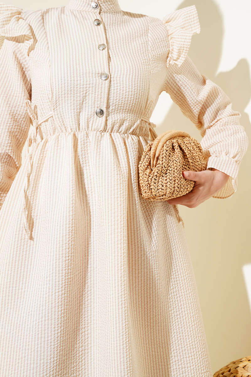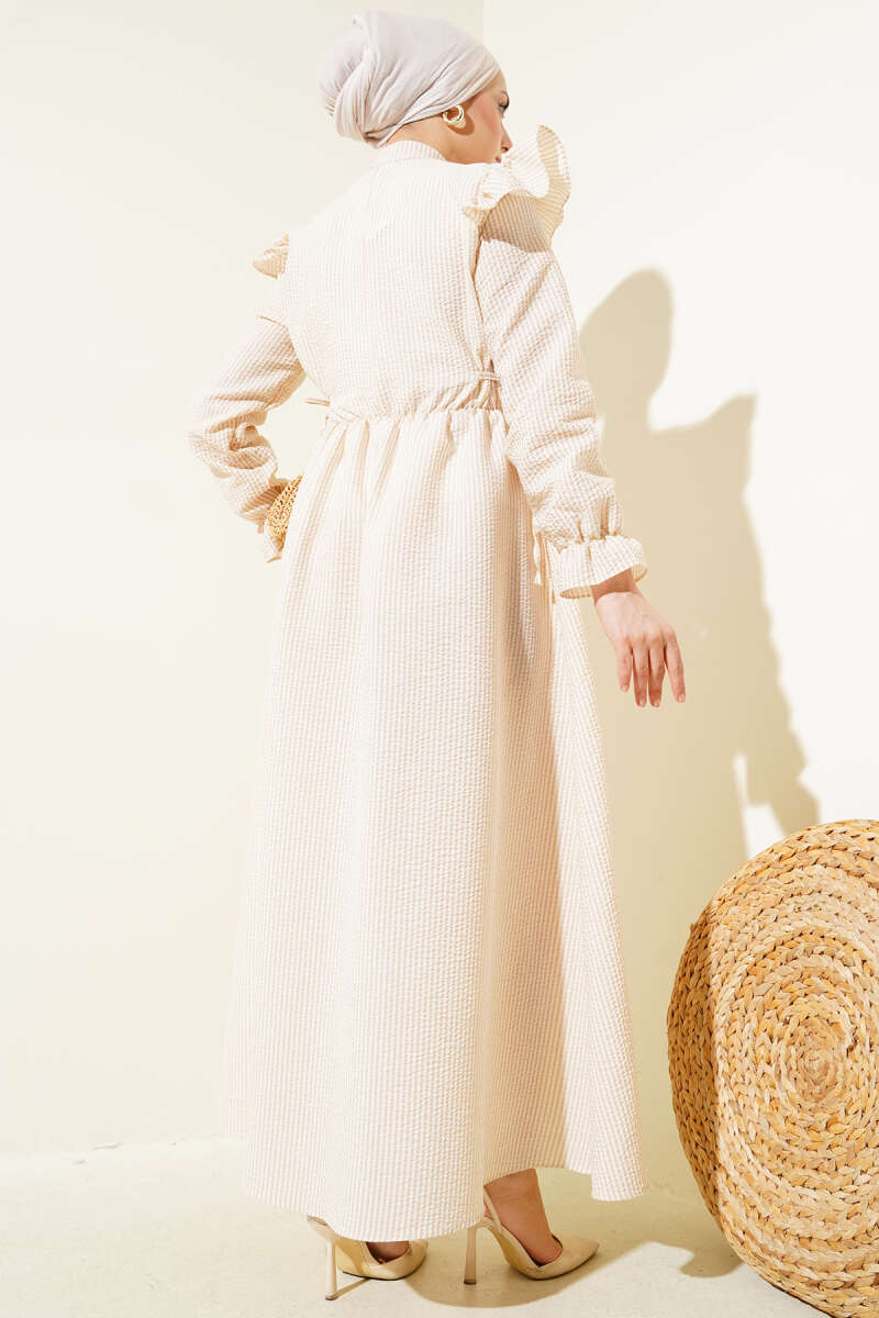 Omuz Fırfırlı Bel Lastikli Gofre Elbise Bej