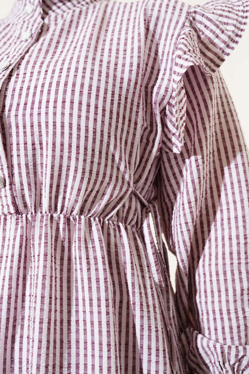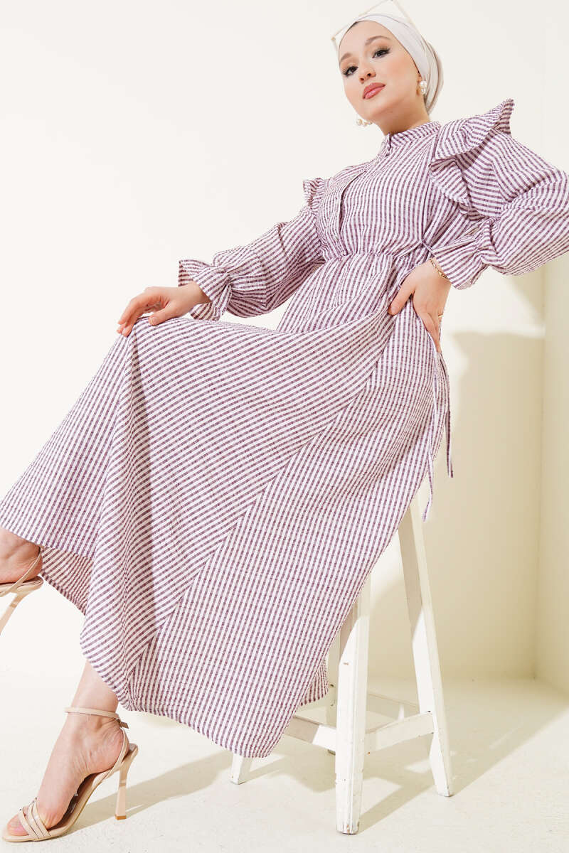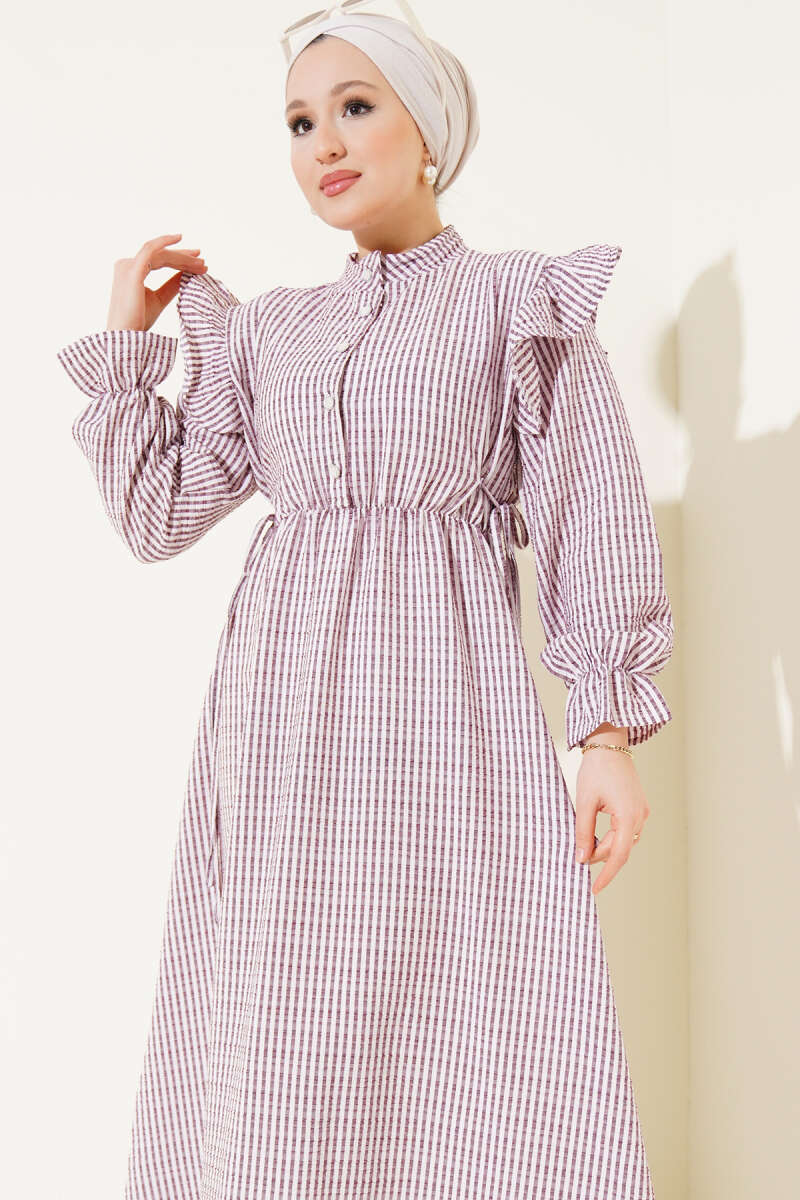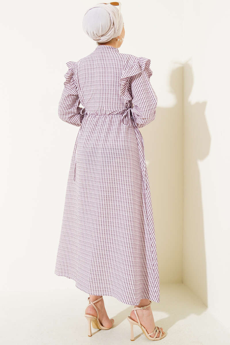 Ekose Desenli Kemerli Jile Elbise Bordo