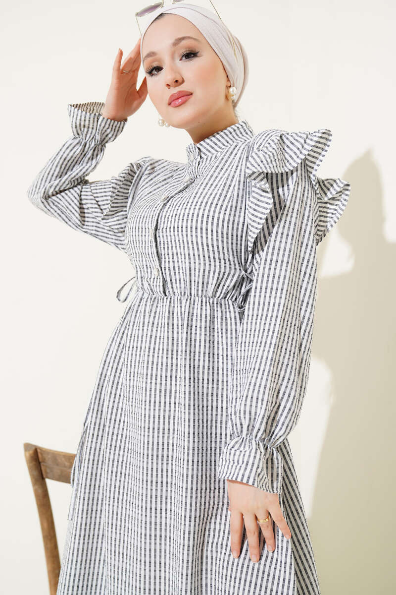Ekose Desenli Kemerli Jile Elbise Siyah
