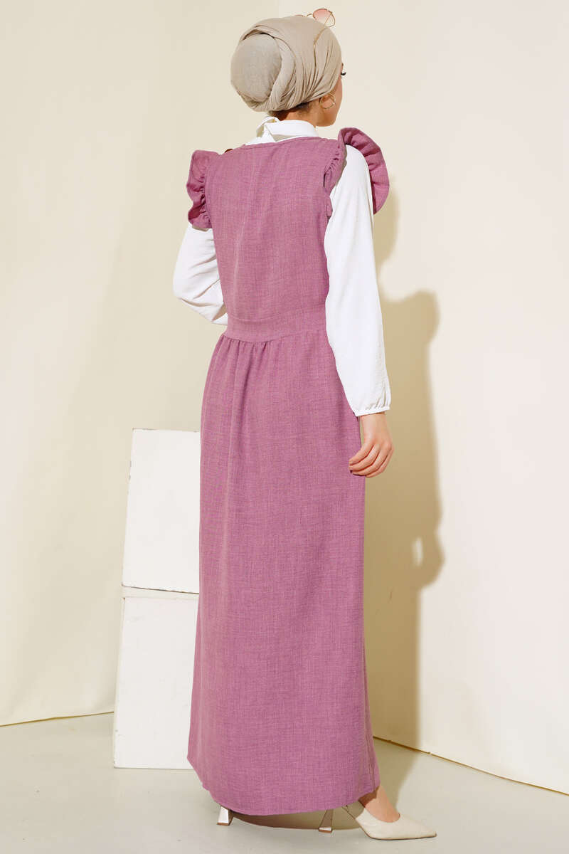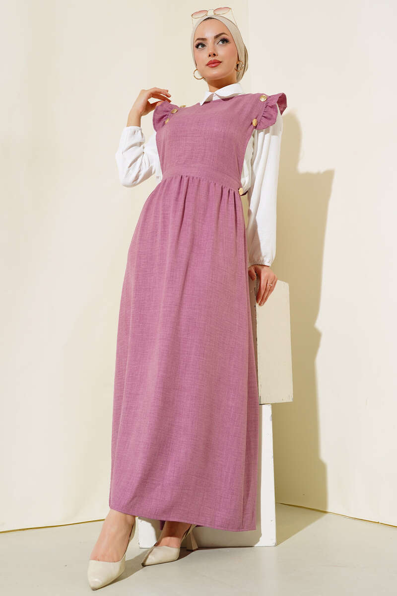 Yeni sezon fırfırlı ikili takım elbisemiz sizlerle. Omuzlarında 3 adet belinde 2 adet düğme bulunmaktadır. Kollarında fırfır detayları vardır. Kol bilekleri lastiklidir. Tunik ve jilemiz ayrı parçalar halindedir. İkili takım halinde satılan elbisemiz salaş modeldir. Renk seçenekleri mevcuttur.