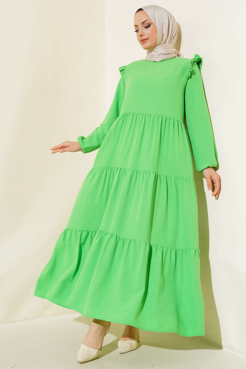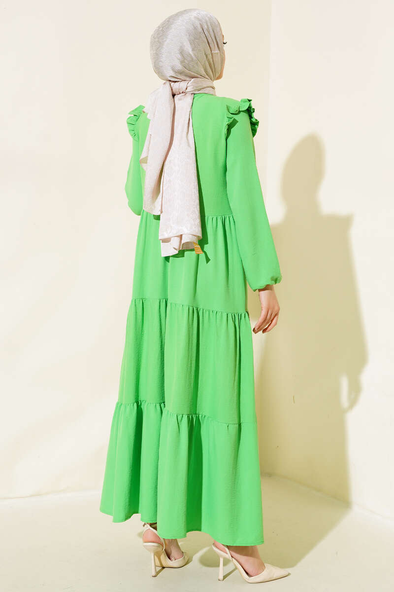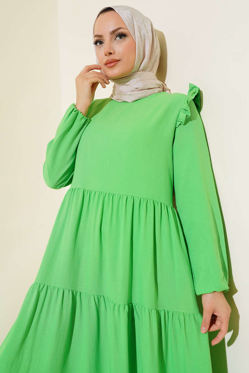 Yeni sezon elbisemiz harika tasarımıyla sizler için geldi. Elbisemizin omuzları fırfır detaylıdır. Enseden düğmelidir. Kol bilekleri lastiklidir. Elbisemiz kat kat modeldir. Astarsızdır. Salaş modeldir. Elbisemiz yaz ve bahar aylarınızın favori elbisesi olacaktır. Renk seçeneklerimiz mevcuttur.