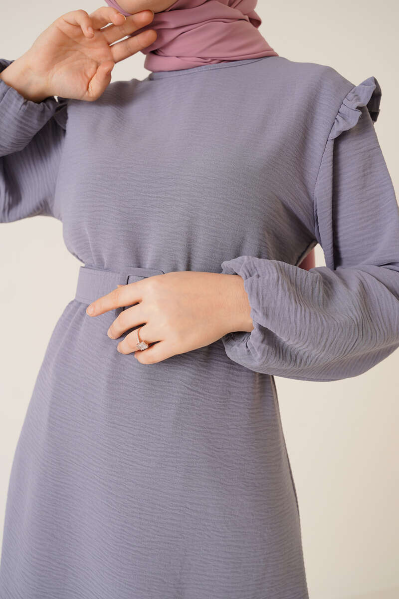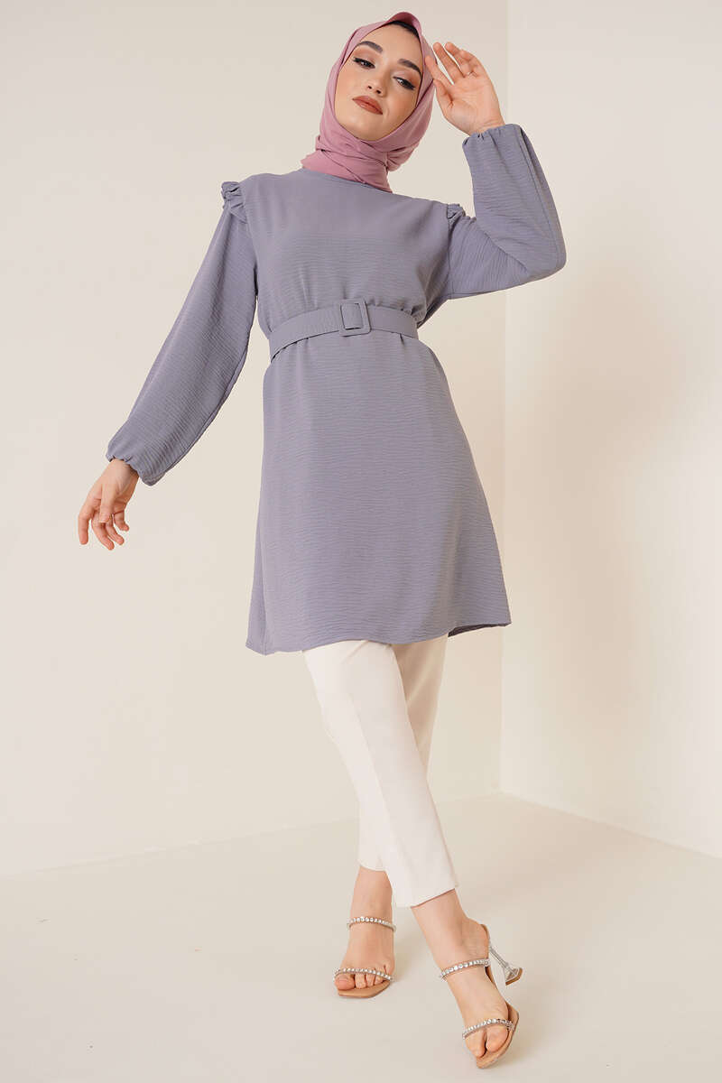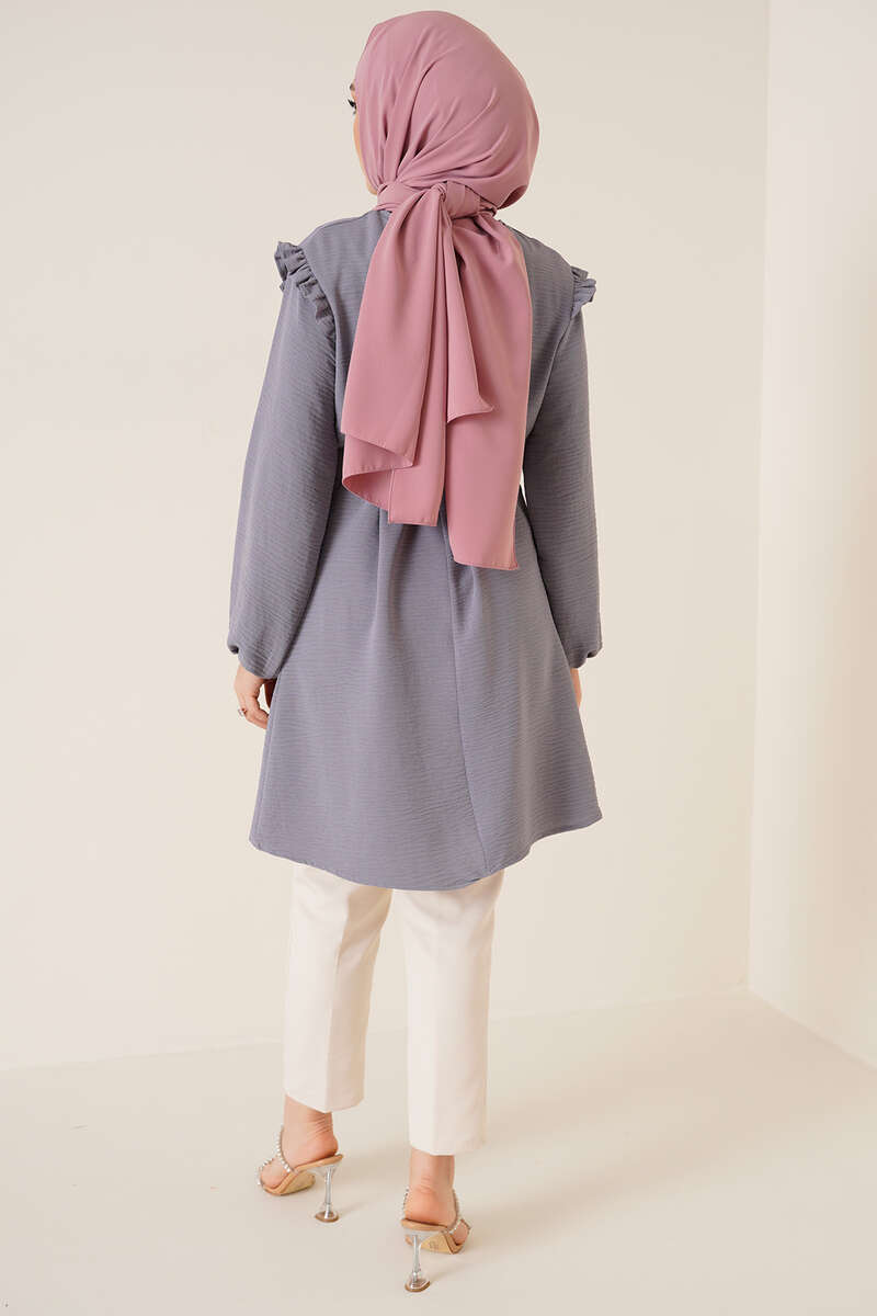 Yeni sezon tuniğimiz omuz fırfırlı detaylıdır. Düşük omuz model olan tuniğimiz oval yakadır. Ense düğmesi bulunmaktadır. Beli kemerli tuniğimizin kemeri kendi rengindedir. İki adet kemer köprüsü bulunmaktadır. Bilekleri lastiklidir.