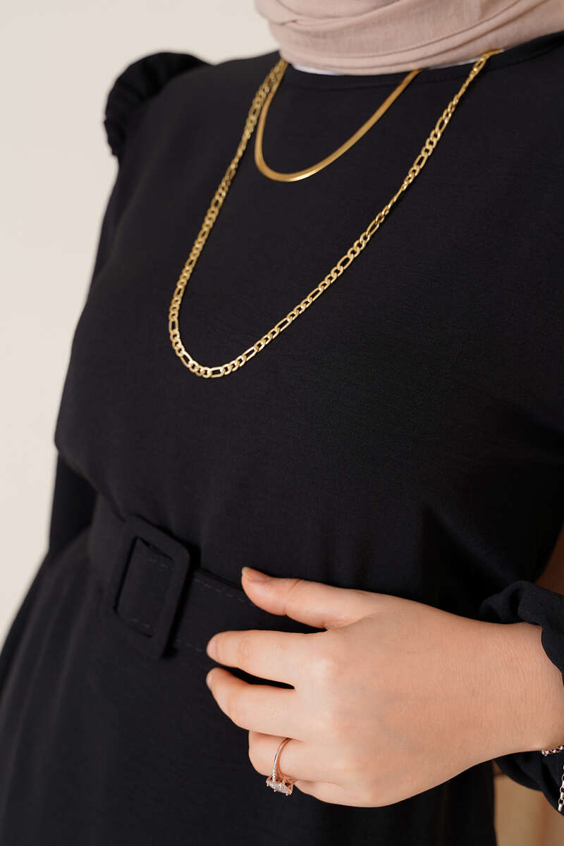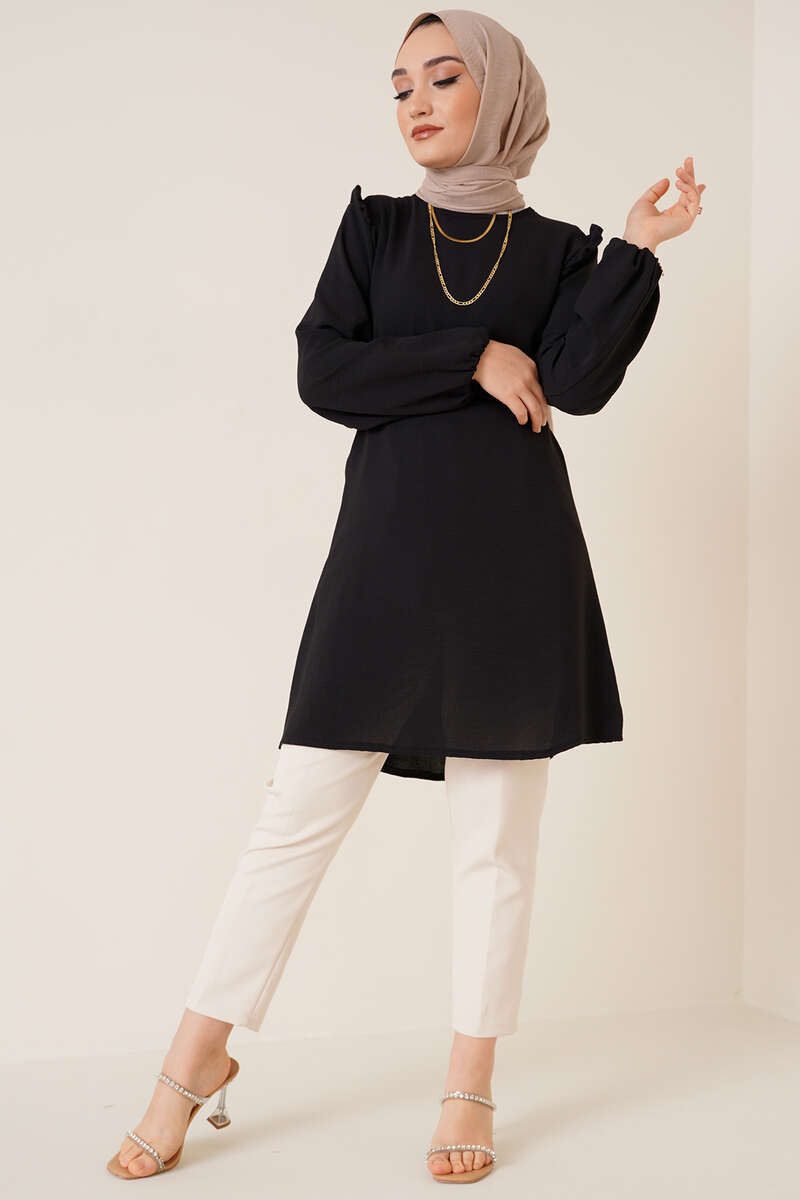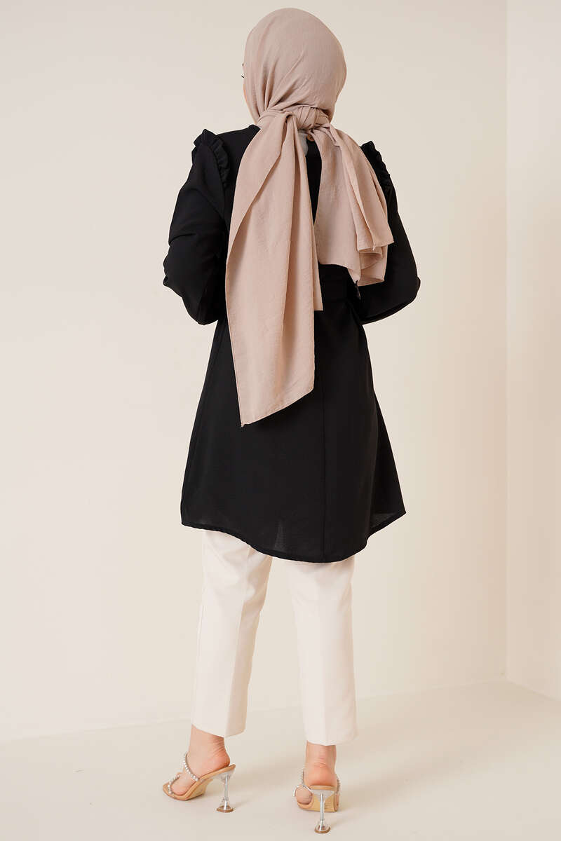 Yeni sezon tuniğimiz omuz fırfırlı detaylıdır. Düşük omuz model olan tuniğimiz oval yakadır. Ense düğmesi bulunmaktadır. Beli kemerli tuniğimizin kemeri kendi rengindedir. İki adet kemer köprüsü bulunmaktadır. Bilekleri lastiklidir.