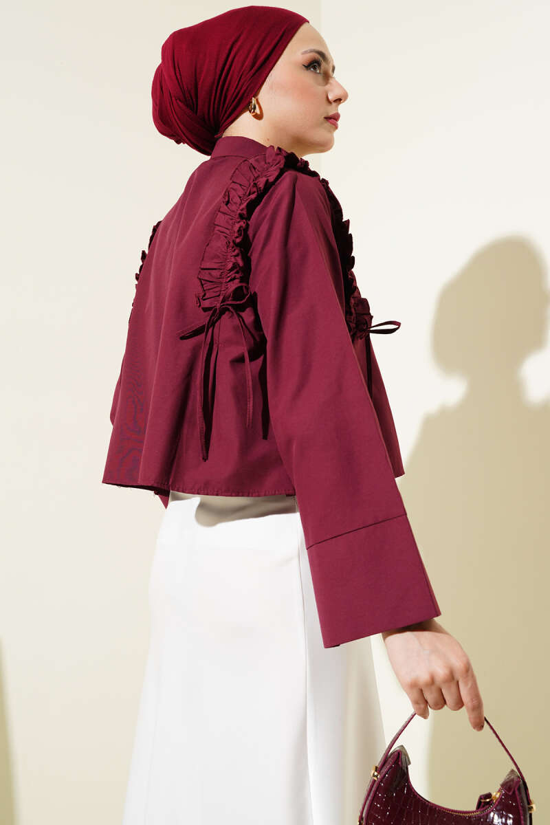 Gizli Düğmeli Bel Kuşaklı Gömlek Bordo